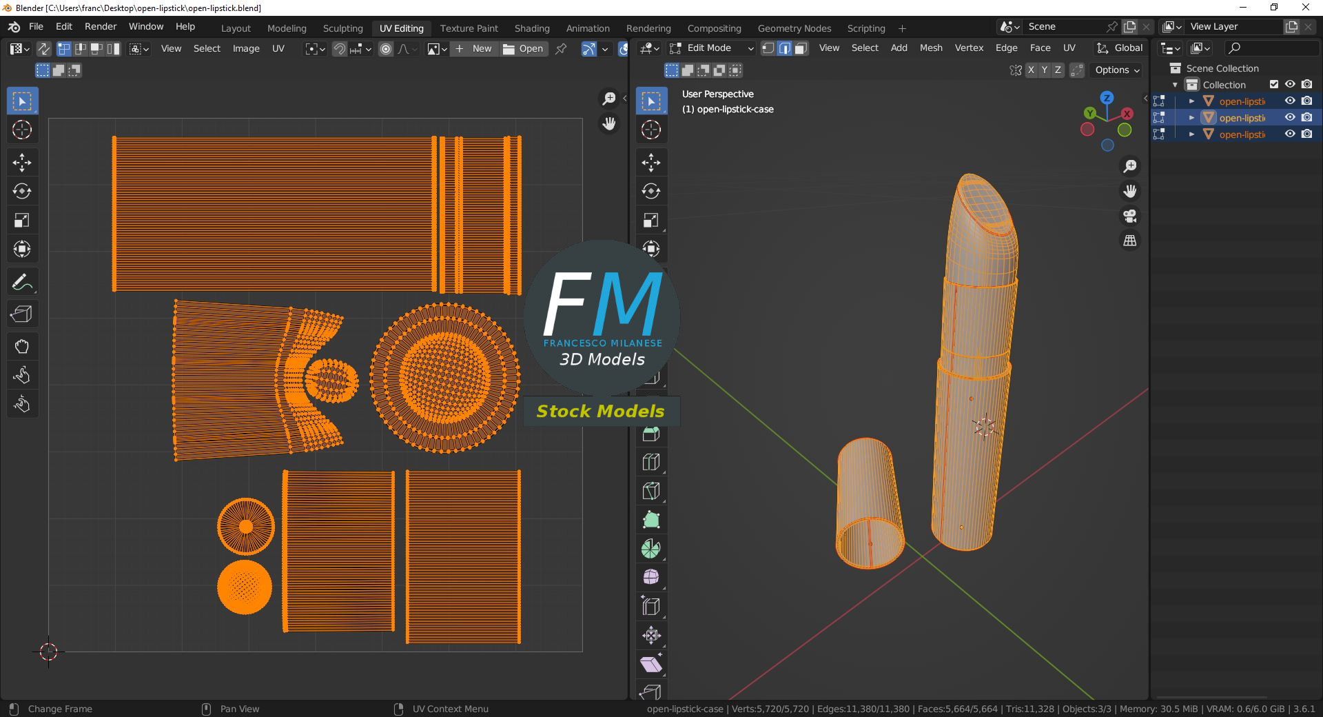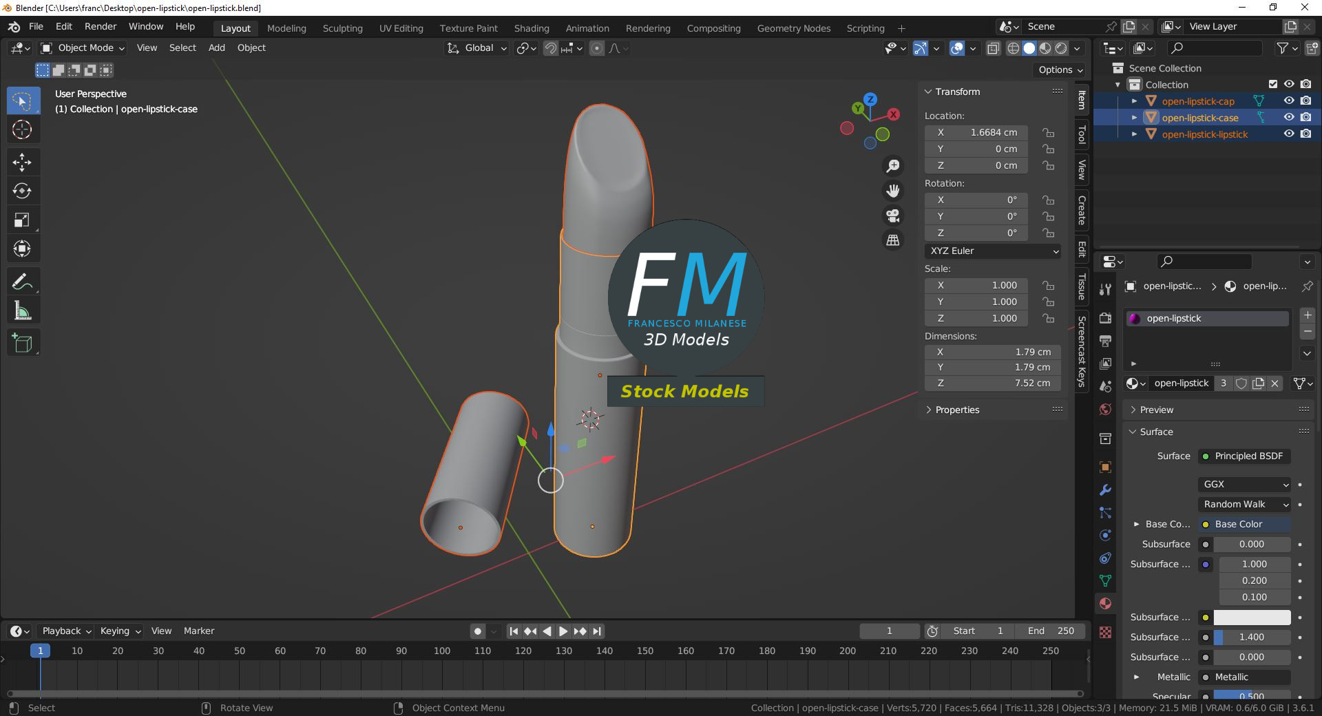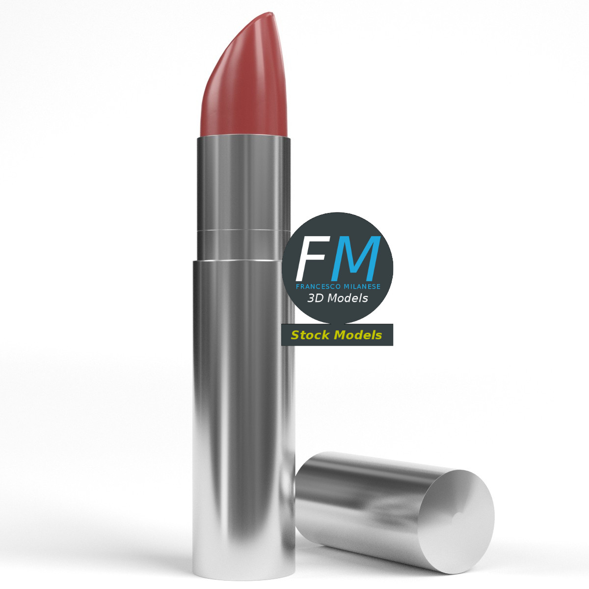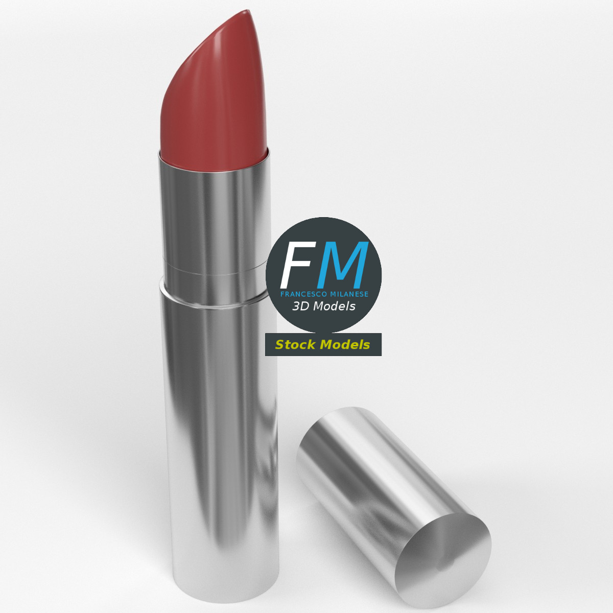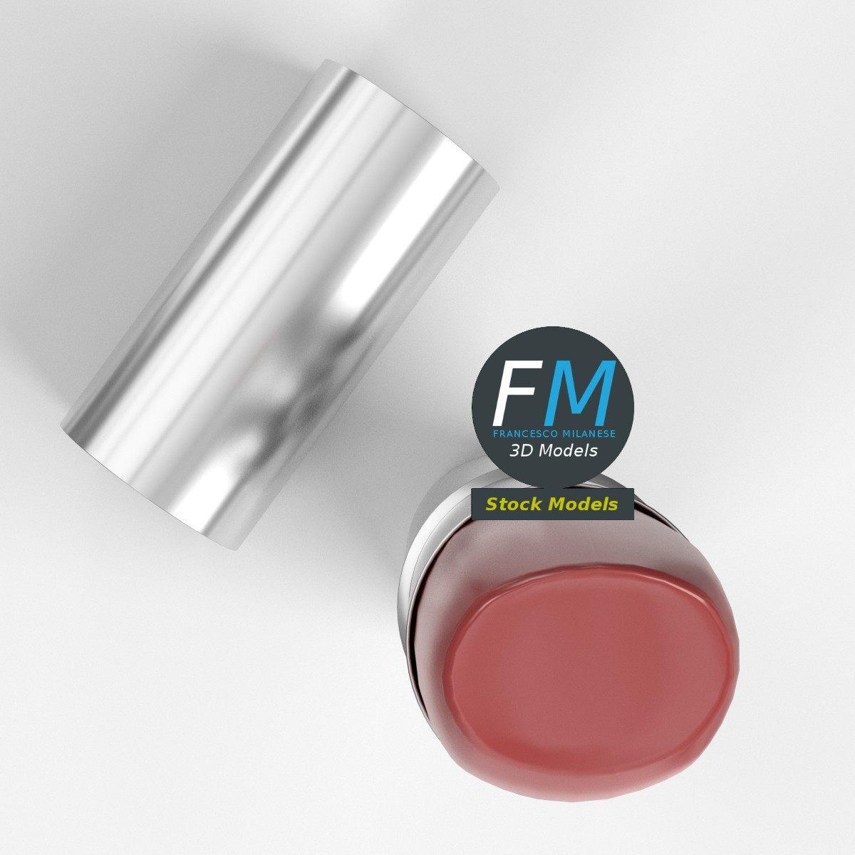 Open lipstick 3D Model. 3 individual objects (case, cap, lipstick), sharing the same non overlapping UV Layout map, Material and PBR Textures set. Production-ready 3D Model, with PBR materials, textures, non overlapping UV Layout map provided in the package.