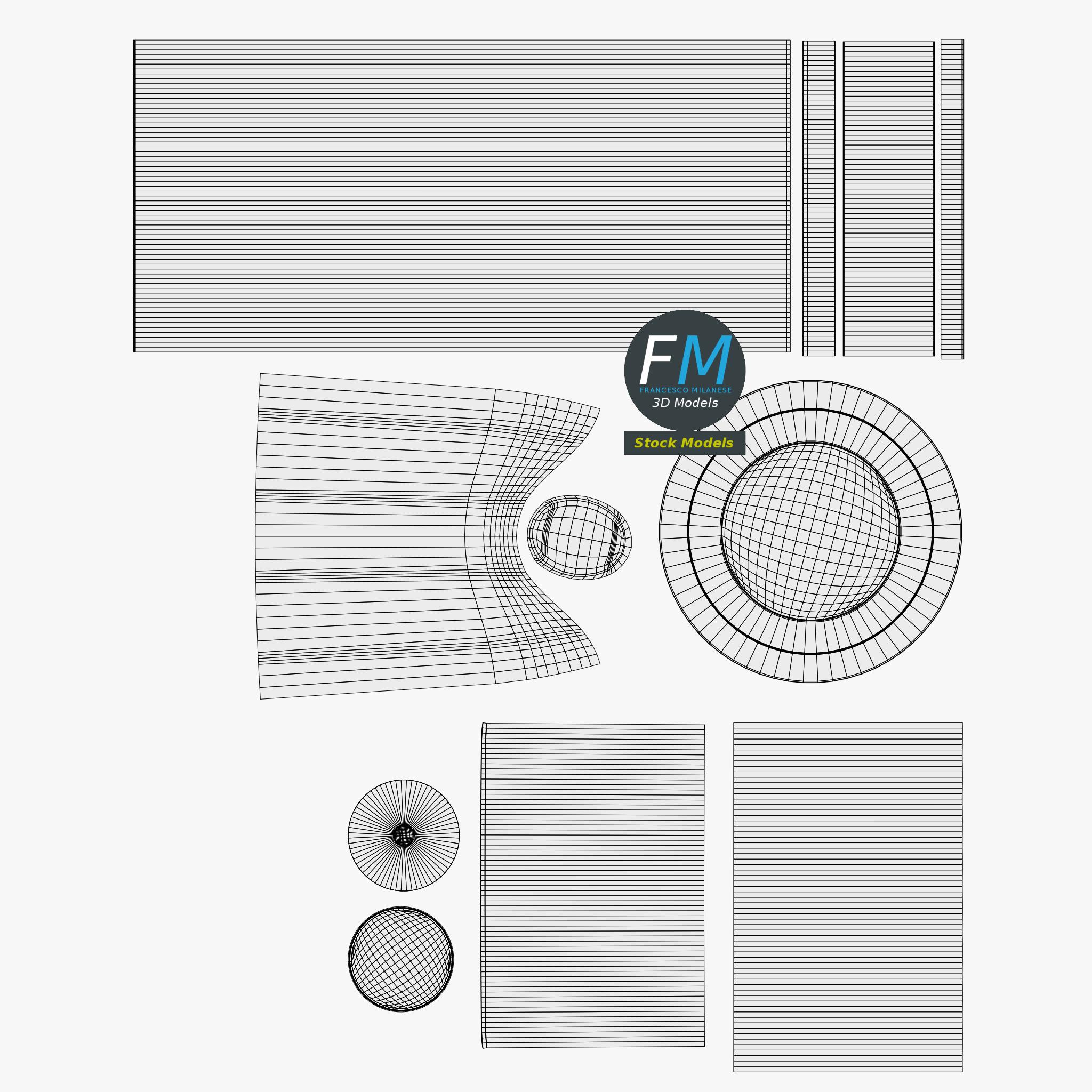 Easily customizable: UV unwrapped geometries; UV Layout maps provided in the package as png with alpha images.