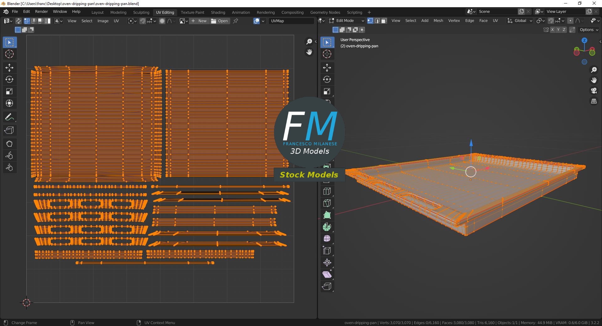 Polygonal, QUADS ONLY (no tris/ngons); 3070 vertices, 3080 quad faces (6160 tris).