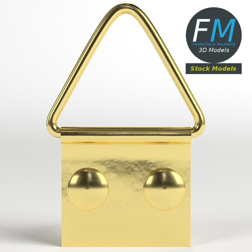 Picture frame hanger kit 3D Model. 4 individual objects (hanger, base, nail 1, nail 2; so, you can easily move or rotate them), sharing the same non overlapping UV Layout map, Material and PBR Textures set. Production-ready 3D Model, with PBR materials, textures, non overlapping UV Layout map provided in the package.