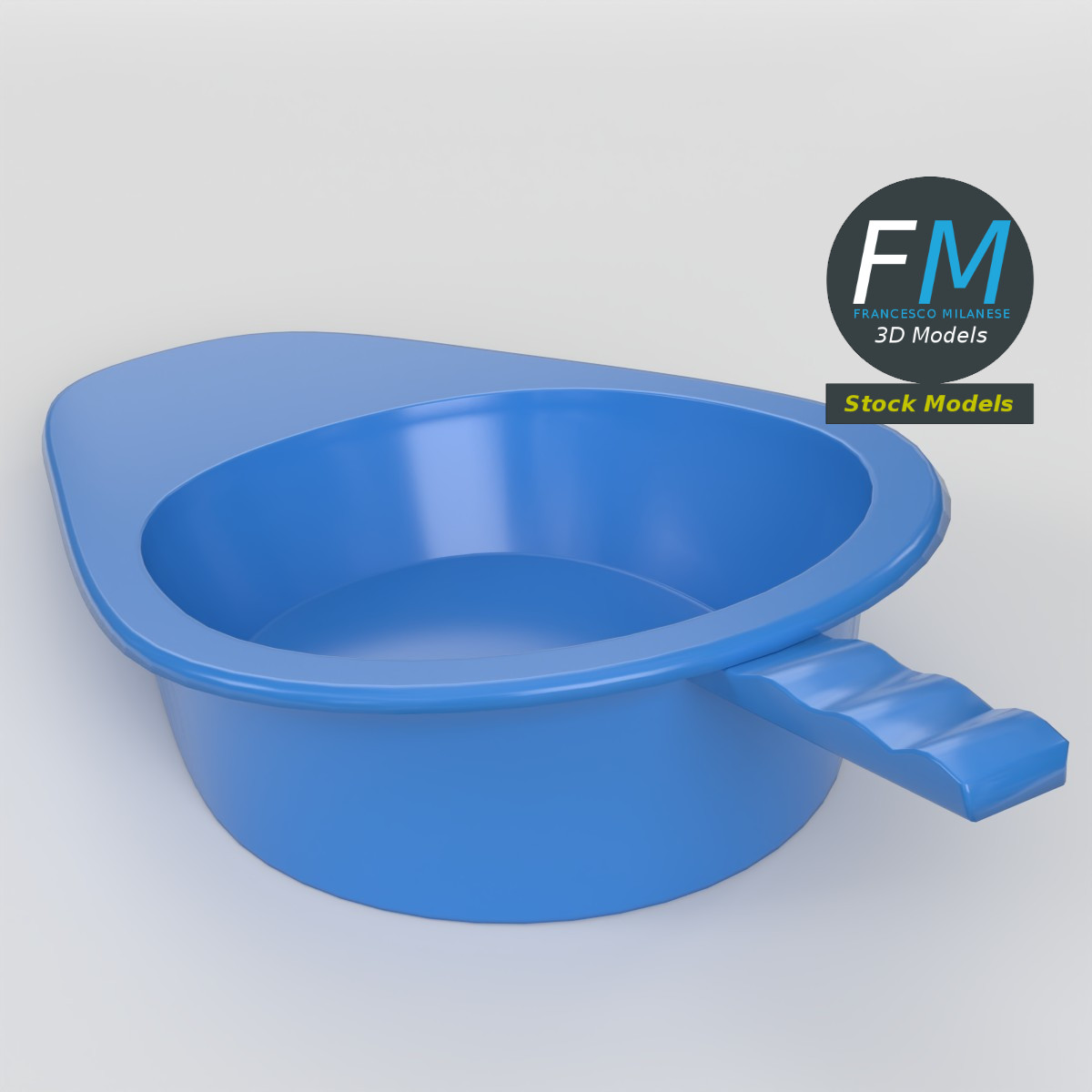 A simple blue plastic portable urinal bedpan with an elongated spout and rounded basin 3D Model, designed for patient care and easy handling. Production-ready 3D Model with non overlapping UV Layout map provided in the package. PBR Materials and Textures (Metallic Workflow: Base Color, Metallic, Roughness, Normal) embedded in the Blend, FBX, and GLB files.