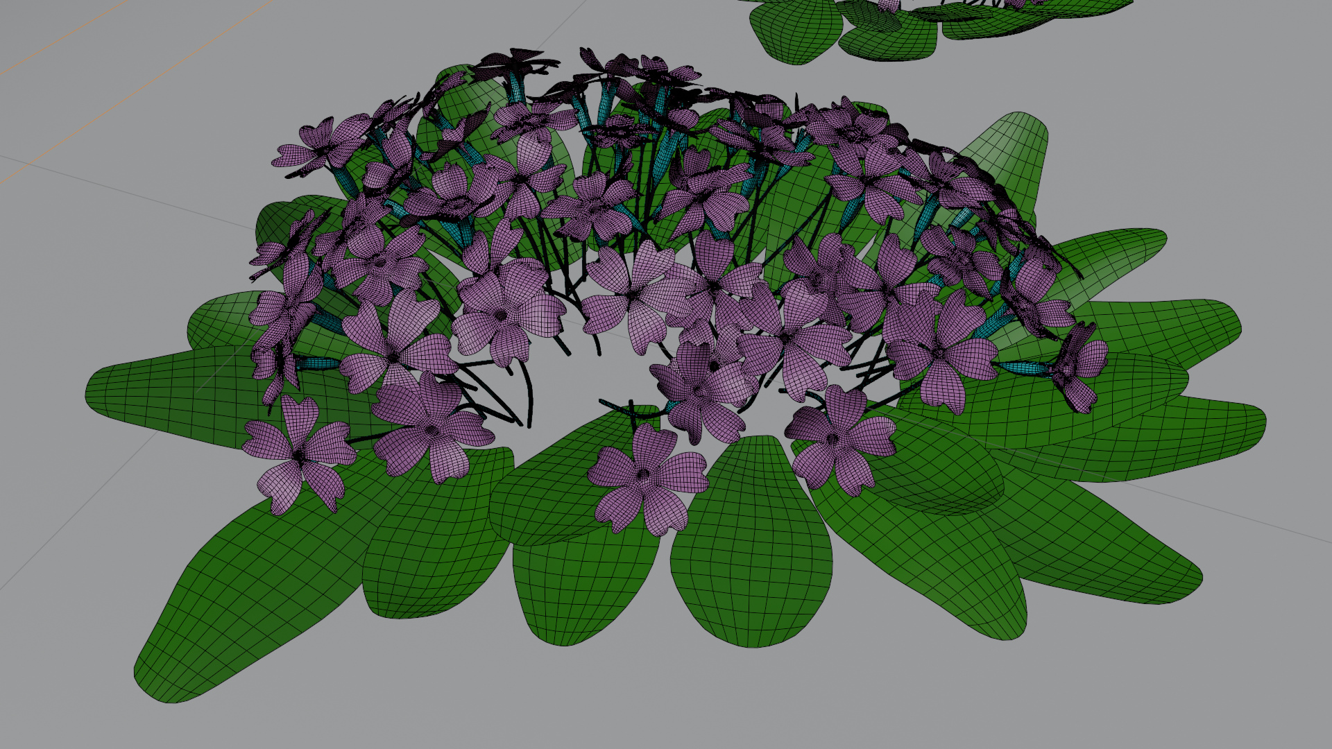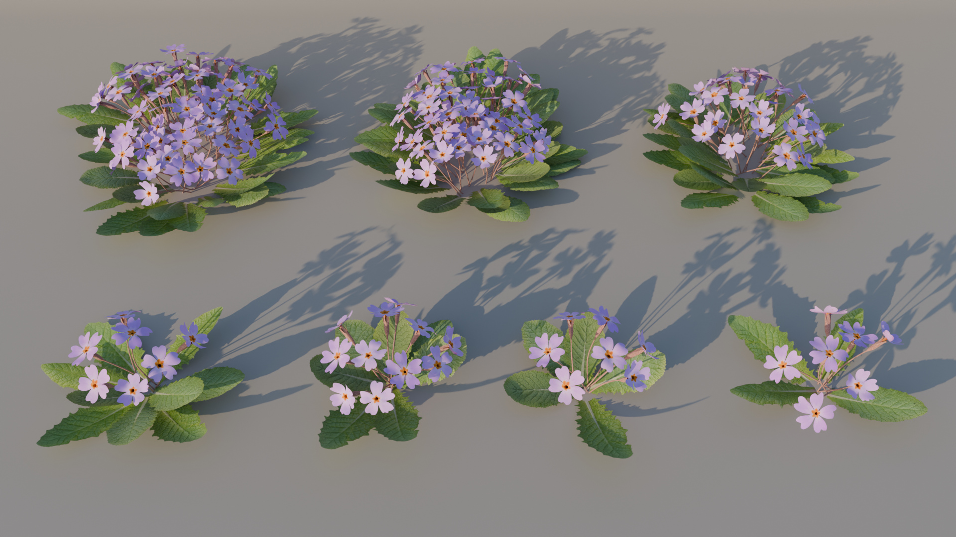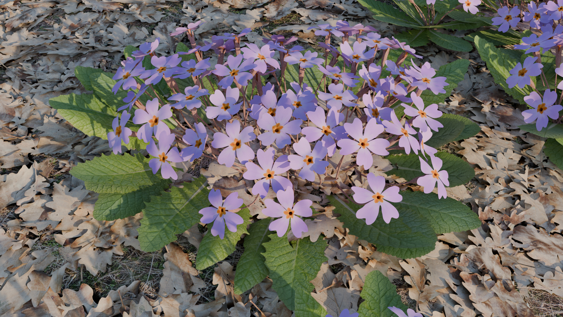 Simple primrose model with spring terrain covered in oak leaves. Blender file contains 6 variations of the plant itself plus oak leaves. A lane with randomly distributed plants was also created with blender geometry node system for illustration purposes.