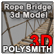 A 20m long rope suspension bridge with ropes and knots, with wooden planks. Wood texture is 2048×2048 with matching normal map. Planks are Uv mapped differently so you don’t see repeats. Rope Texture is 512×512 and repeated, with matching normal map. The knots are physical geometry, so results in a slightly higher poly count but looks better than texture tricks.