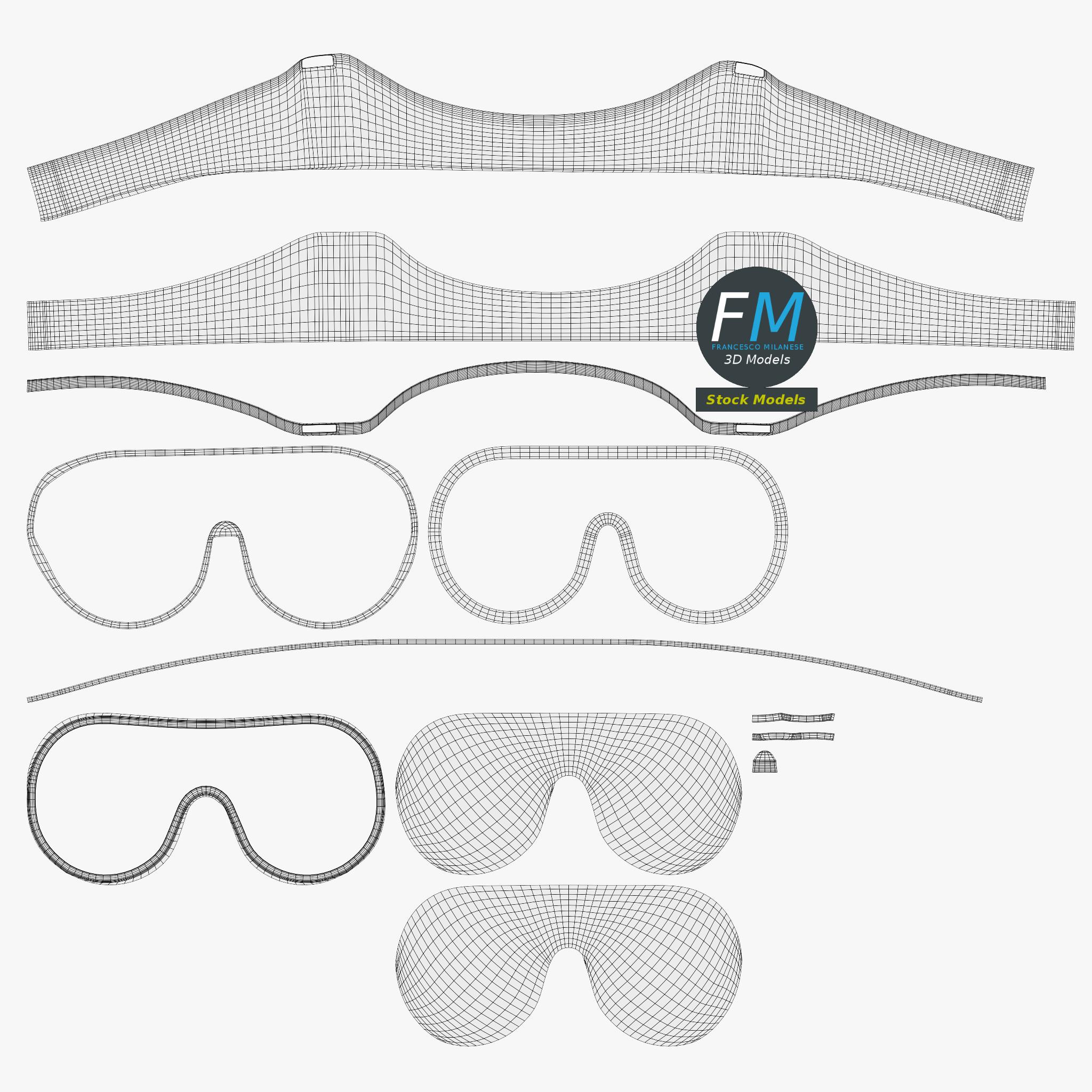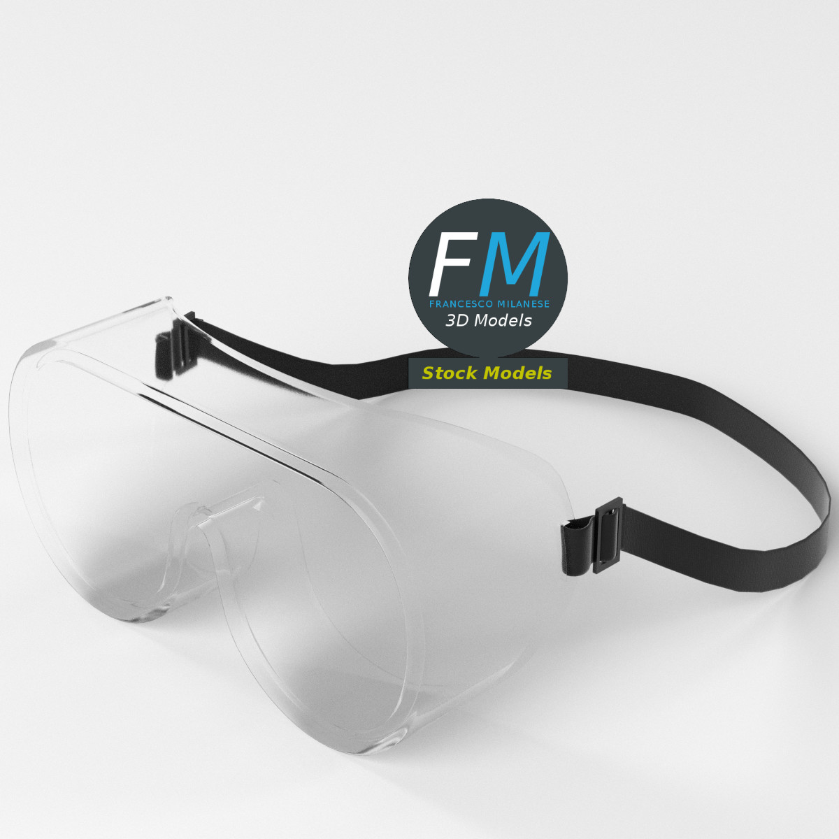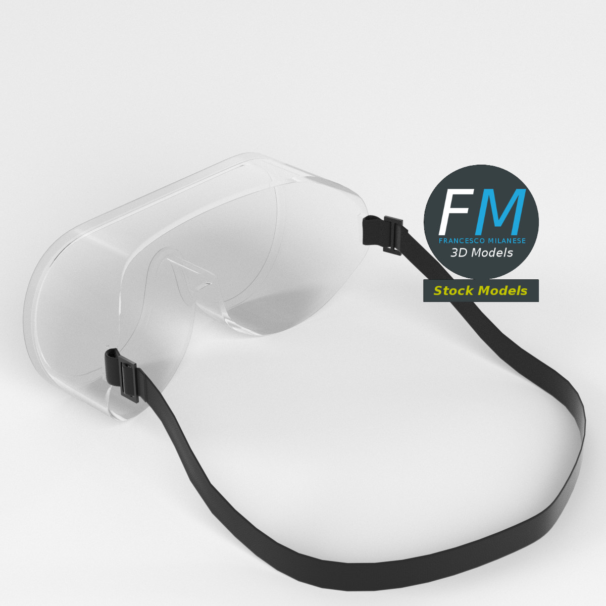 Safety goggles spectacles 3D Model. 2 individual objects (transparent, laces), each one with its own non overlapping UV Layout map, Material and PBR Textures set. Production-ready 3D Model, with PBR materials, textures, non overlapping UV Layout map provided in the package.