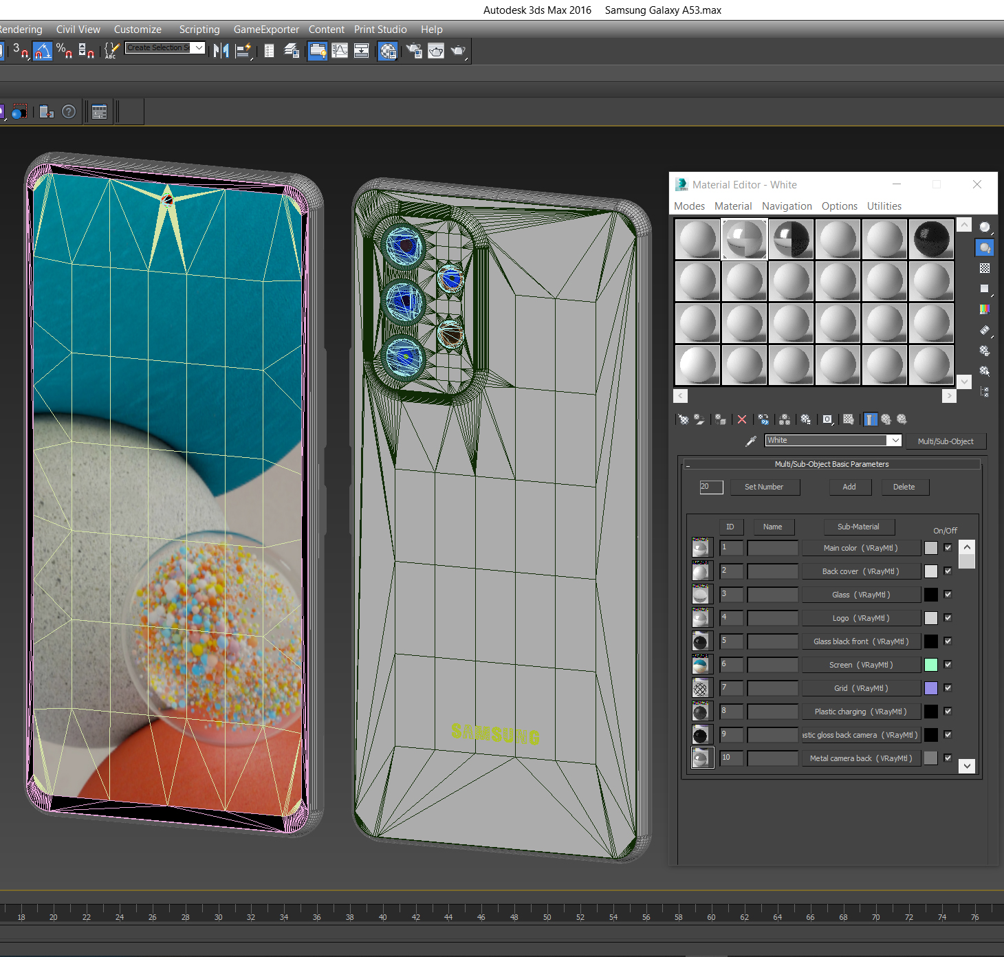 - Highly detailed model of the Samsung Galaxy A53 smartphone. - The model is made in Fusion 360. - The 3ds max version has a lightweight model with fewer polygons. - In 3ds max and Vray, materials are configured in black and white. - Materials are configured in KeyShot and Blender. - The textures and the HDRI map are in the max 2016 folder. - Formats: 3dm, 3ds, bip, blender, f3d, fbx, iges, ksp, max 2013, max 2016, obj, step, stl.