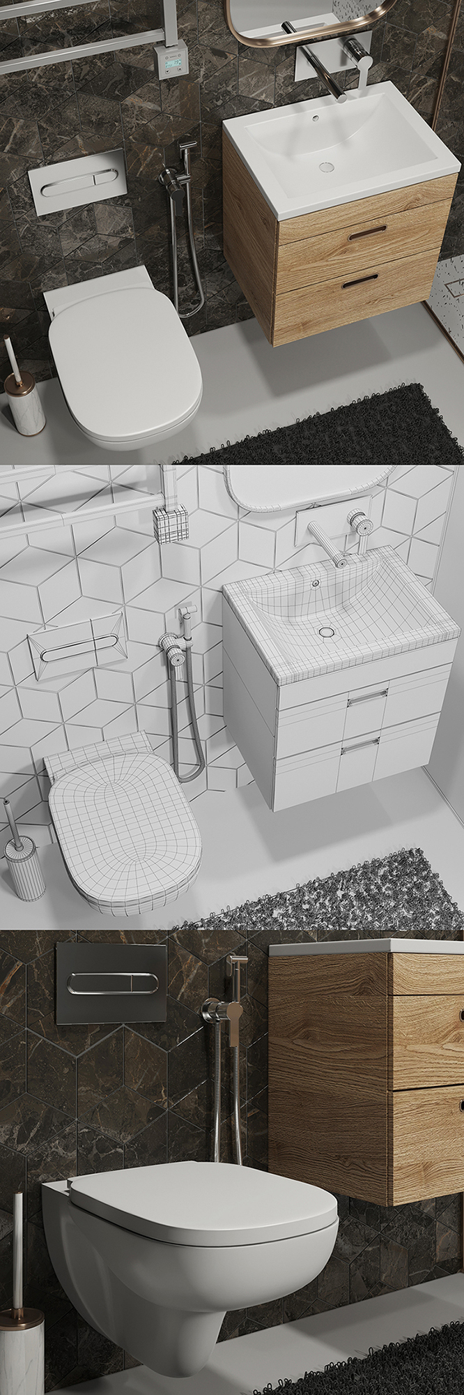 Set Bathroom modeli 3Dmaxda yaratilib, OBJ formatlarida taqdim etiladi, bu esa uni turli 3D dasturlarda osonlik bilan ishlatish imkonini beradi. Yuqori aniqlikdagi PBR teksturalari va realistik tafsilotlar bilan bezatilgan to‘plam interyer dizayni, reklama yoki mahsulot vizualizatsiyasi uchun ideal tanlovdir.