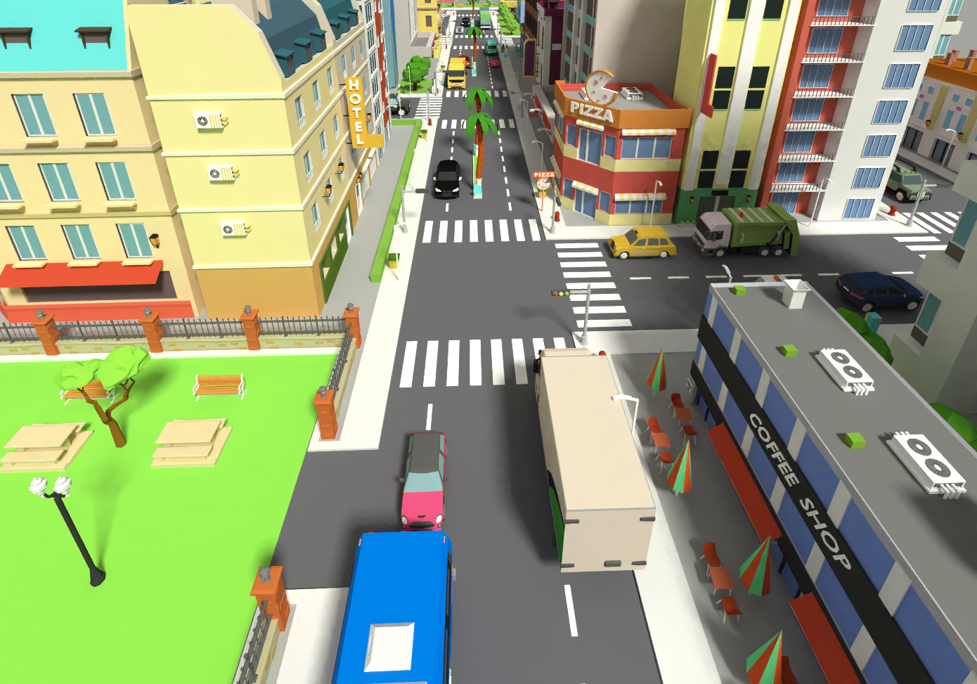 The city does not need a texture and this is in order to make it easier for you to use without problems and very low polygons *The city also contains different types of cars, trucks and grades in addition to traffic signs and different types of trees and many different things all this comes with the organization of buildings and other components of the city Finally, we hope our assets will help you in your business.