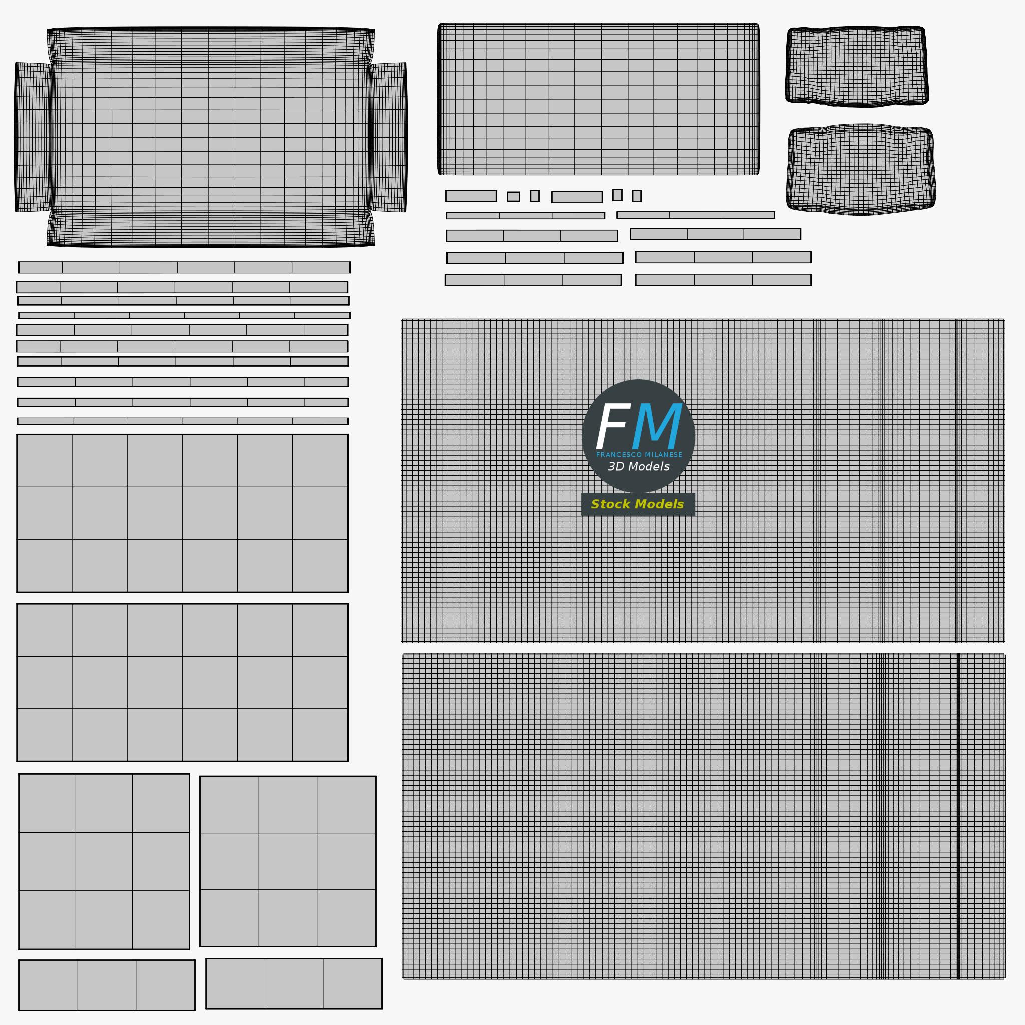 Easily customizable: UV unwrapped geometries, so you can create new Textures (or modify the existing ones) using the UV Layout maps provided in the package (as png with alpha).