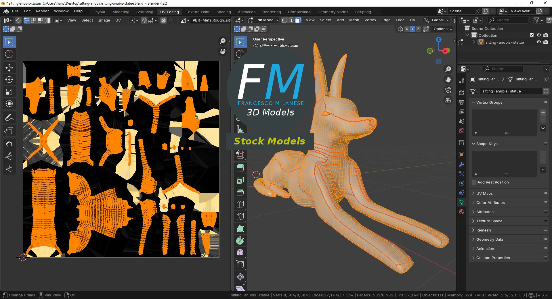 Polygonal, QUADS ONLY (no tris/ngons); 8584 vertices, 8582 quad faces (17164 tris).