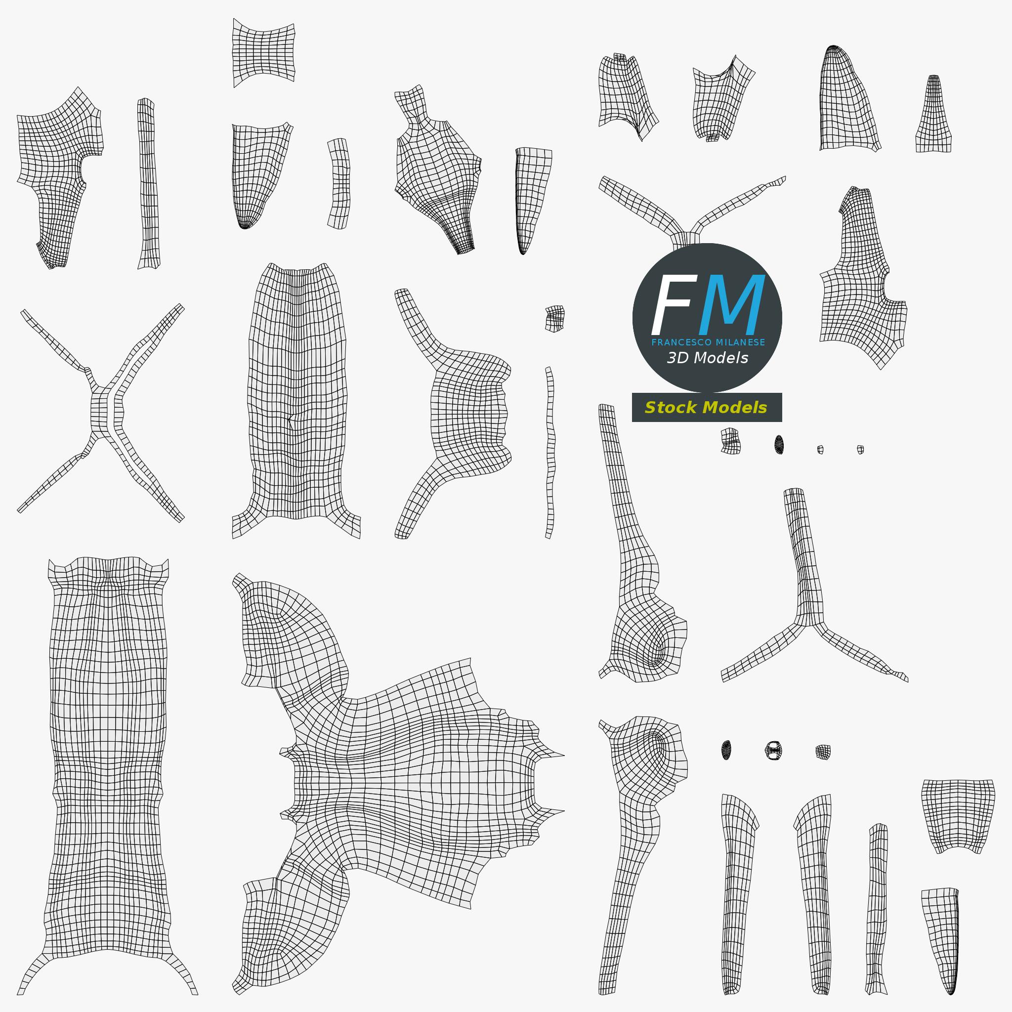 Easily customizable: UV unwrapped geometries; UV Layout maps provided in the package as png with alpha images.