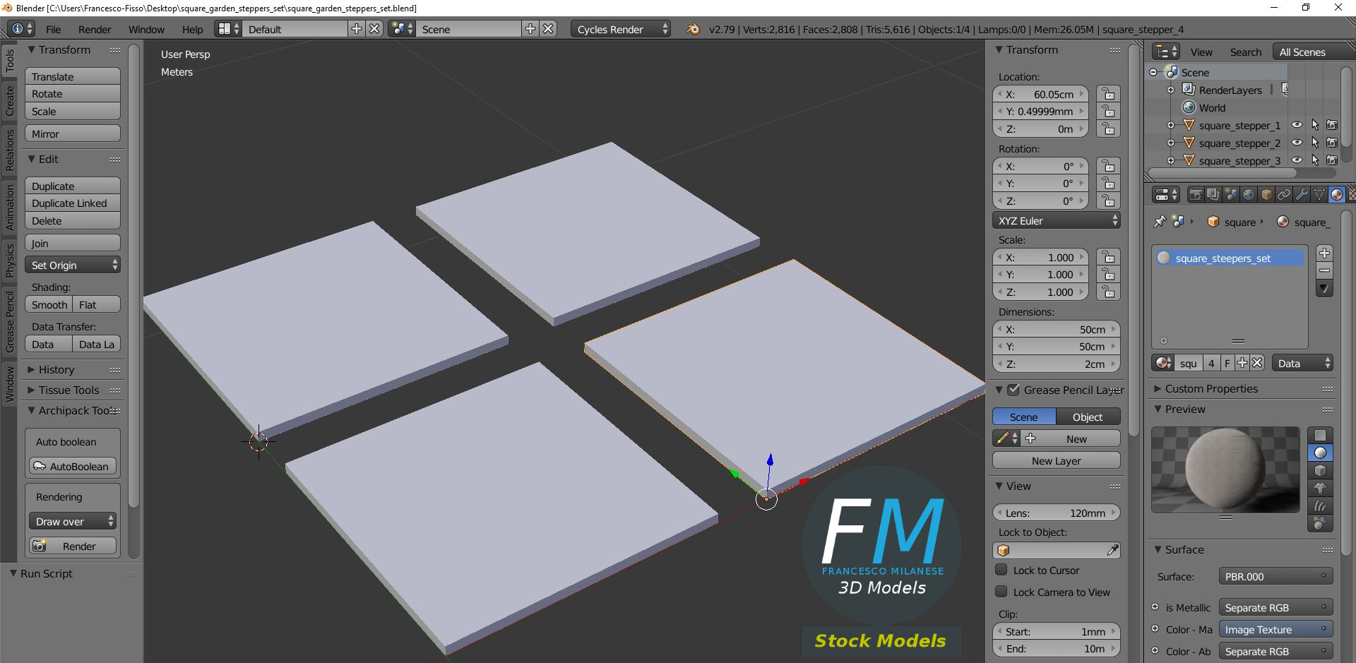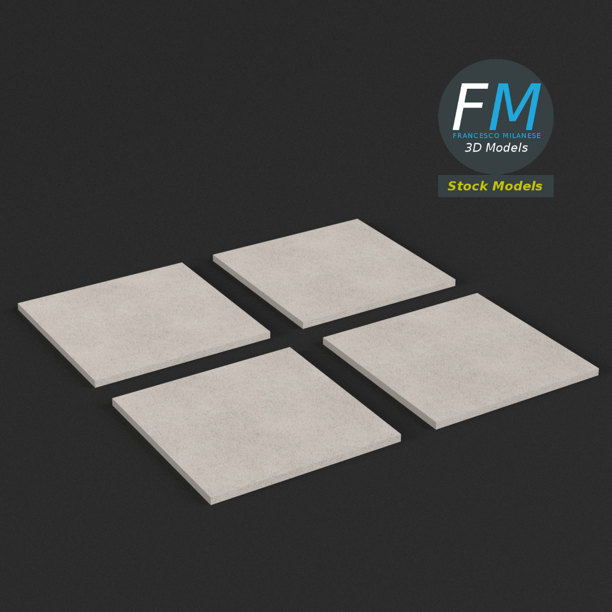 A set of four square garden steppers stones 3D Models; 4 objects sharing the same non overlapping UV Layout map, Material and PBR Textures set. Production-ready 3D Model, with PBR materials, textures, and non overlapping UV Layout map provided in the package.