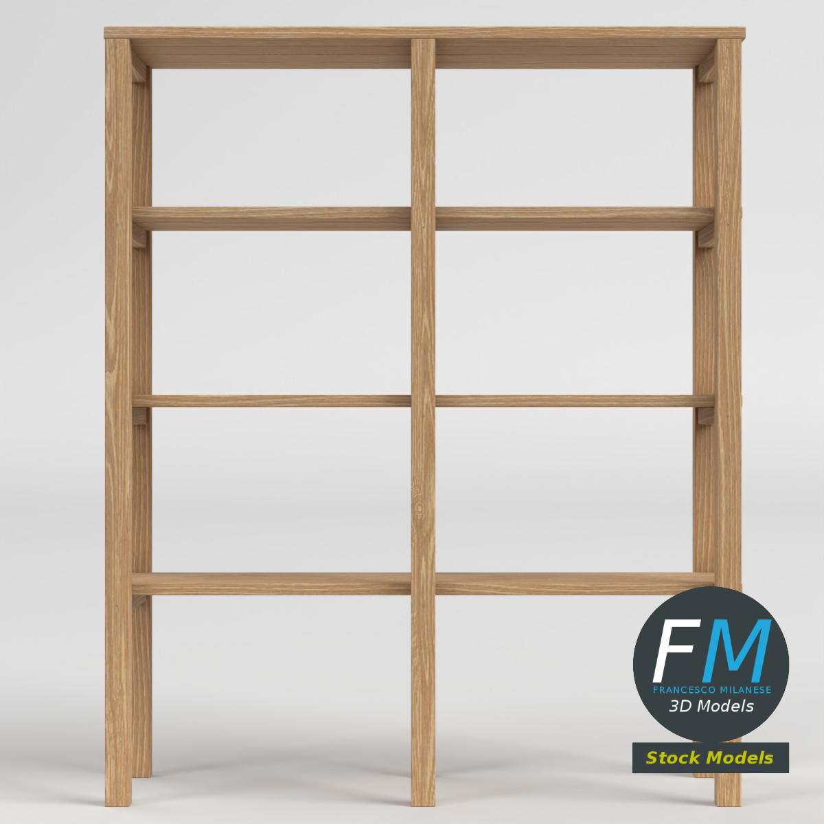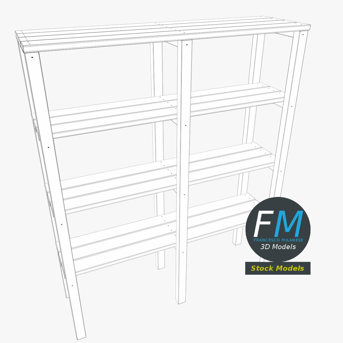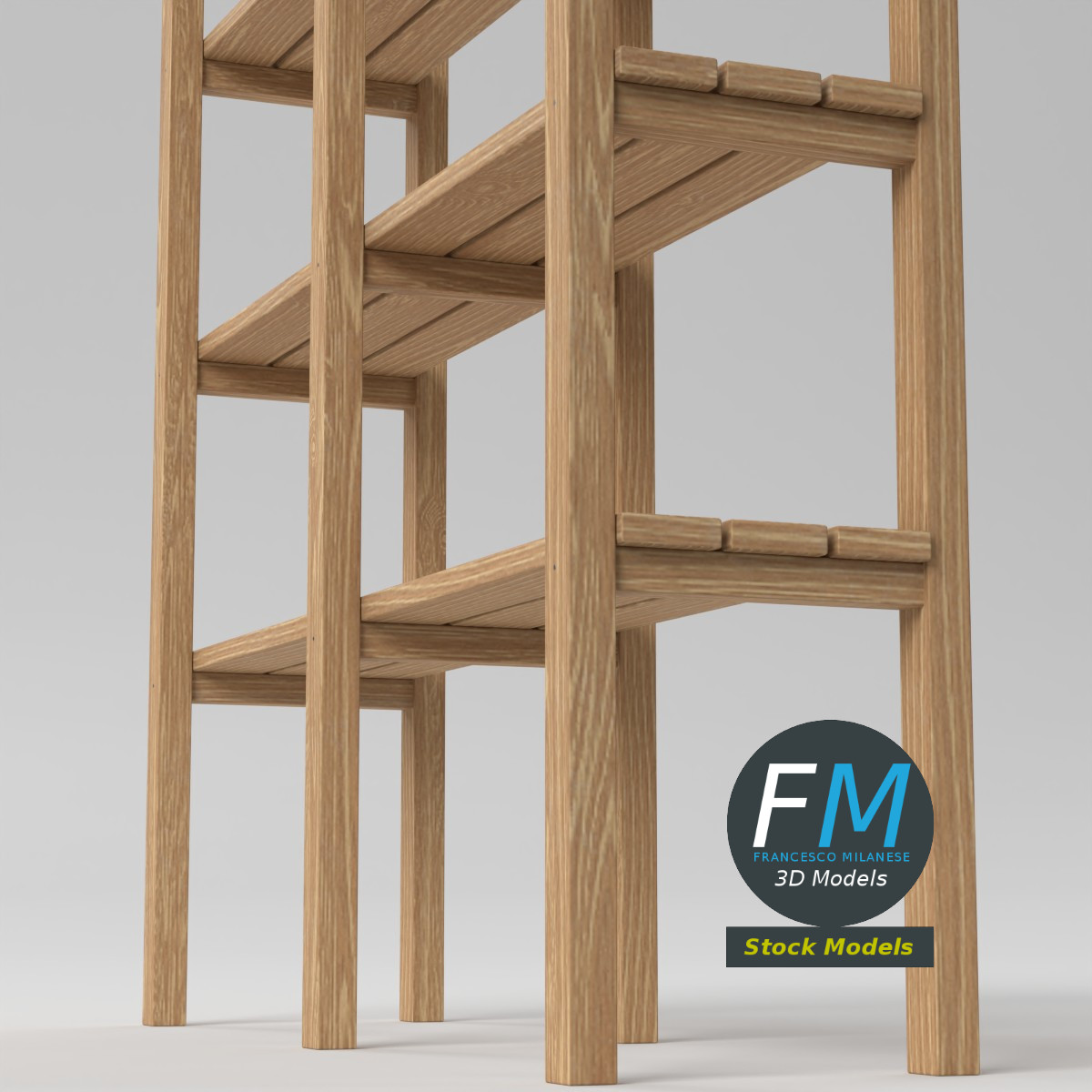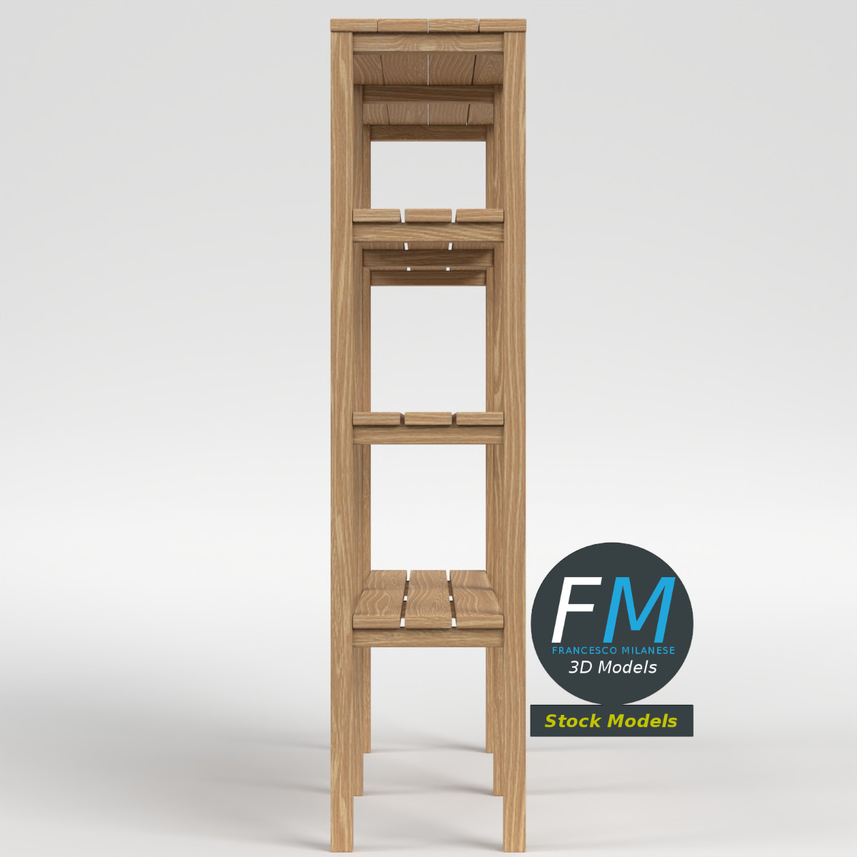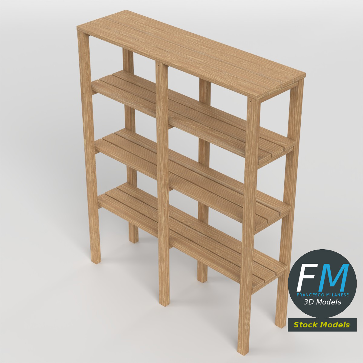 A clean and functional wooden storage shelf 3D Model featuring a natural wood finish, straight vertical supports, and multiple open shelves, ideal for interior visualization, furniture layouts, game environments, and architectural renders requiring simple, realistic storage furniture. 1 Object, 1 Non-Overlapping UV Layout Map, 1 Material with PBR Textures set. Production-ready 3D Model with non overlapping UV Layout map provided in the package. PBR Materials and Textures (Metallic Workflow: Base Color, Metallic, Roughness, Normal) embedded in the Blend, FBX, and GLB files.