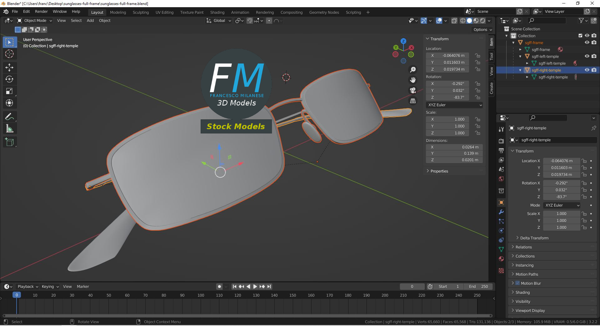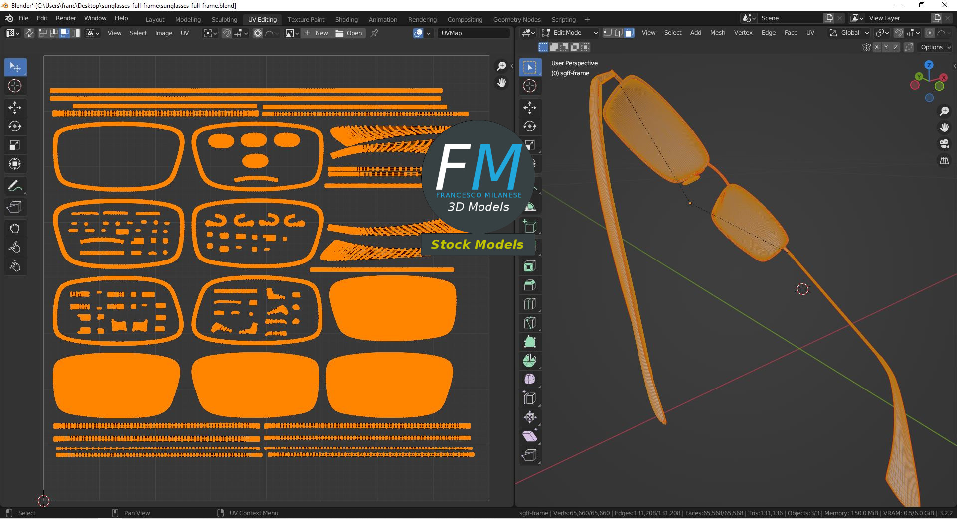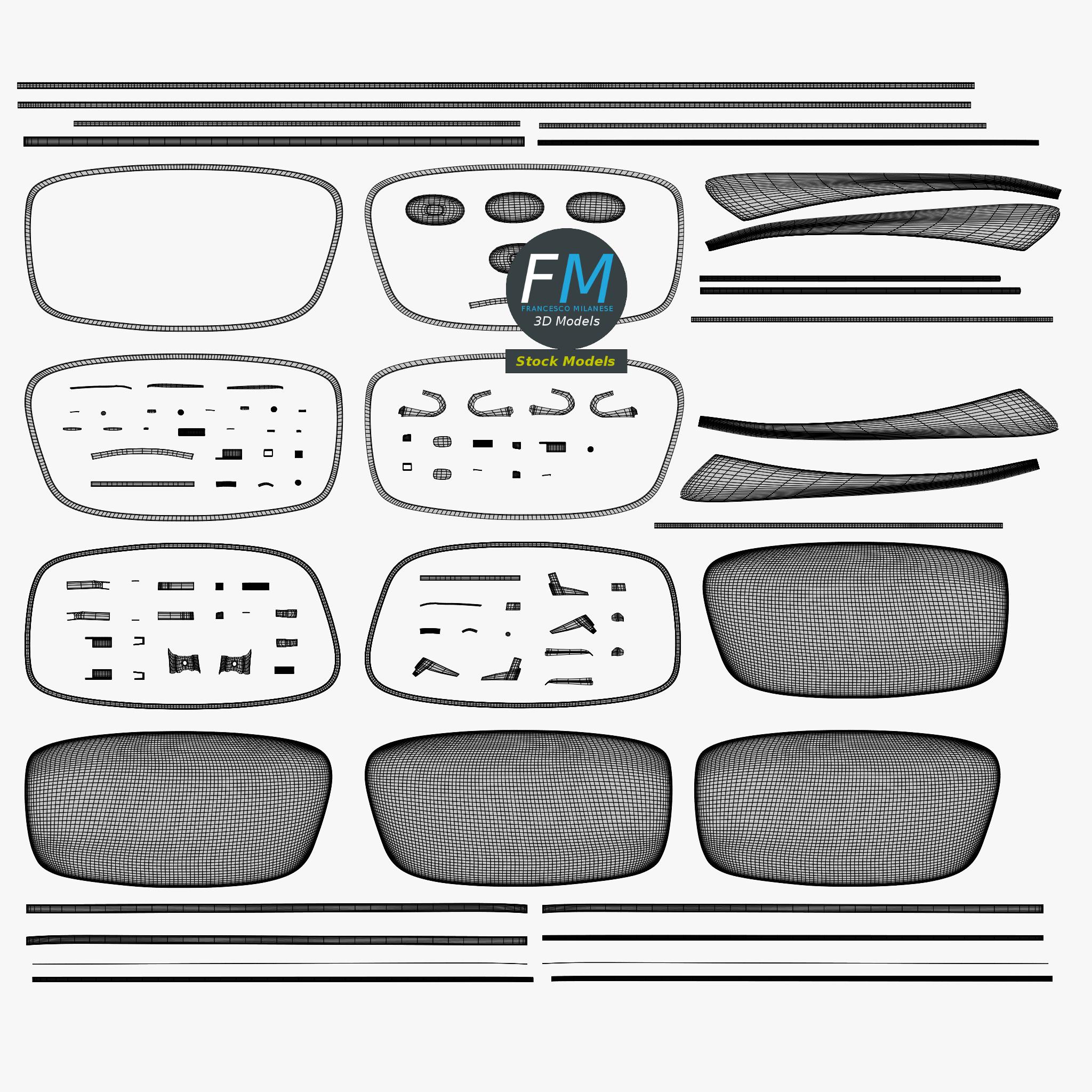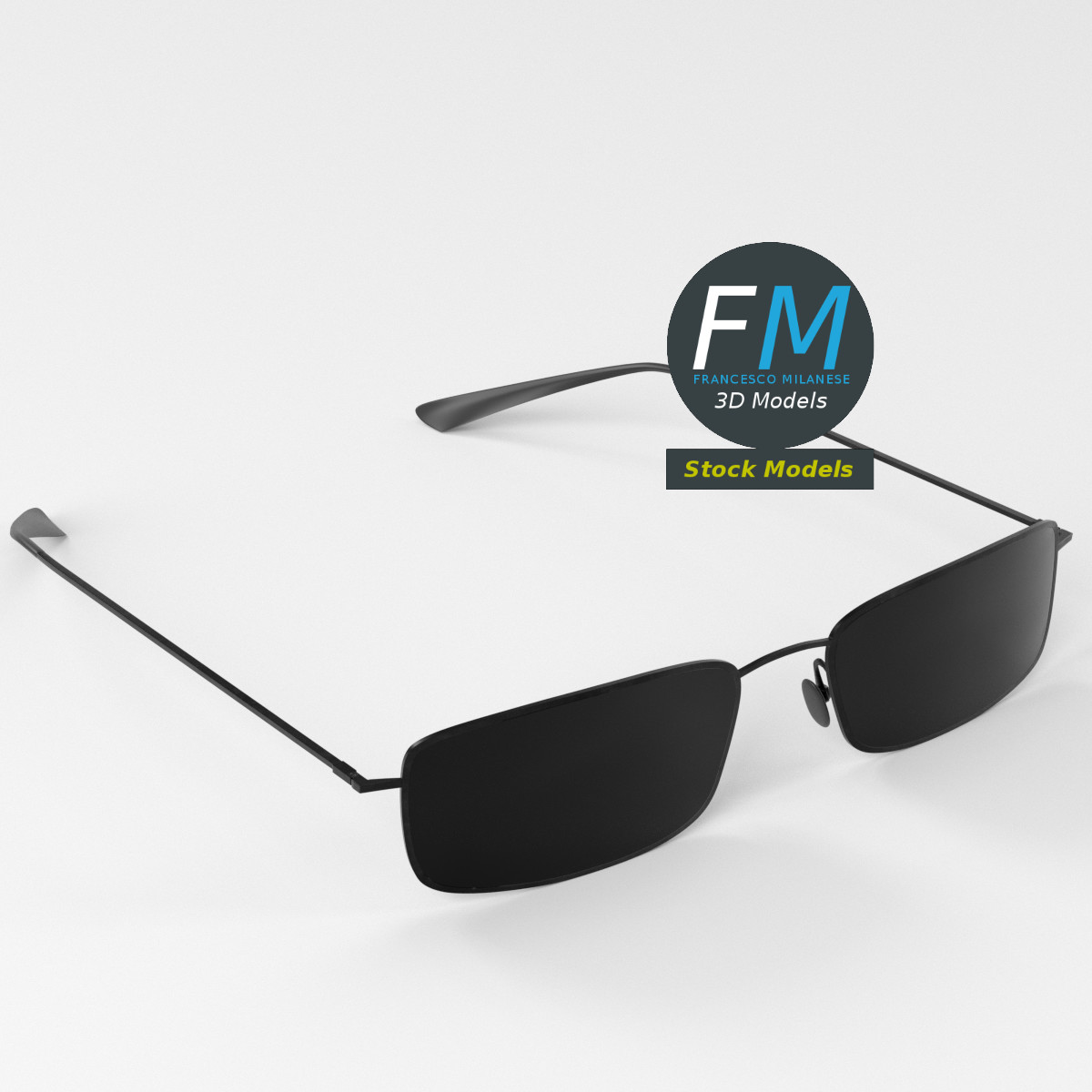 Full frame sunglasses 3D Model. 3 individual objects (frame with mirror-like lenses, right temple, left temple; so, you can easily rotate or even animate the temples), sharing the same non overlapping UV Layout map, Materials (no transparency!) and PBR Textures set. Production-ready 3D Model, with PBR materials, textures, non overlapping UV Layout map provided in the package.