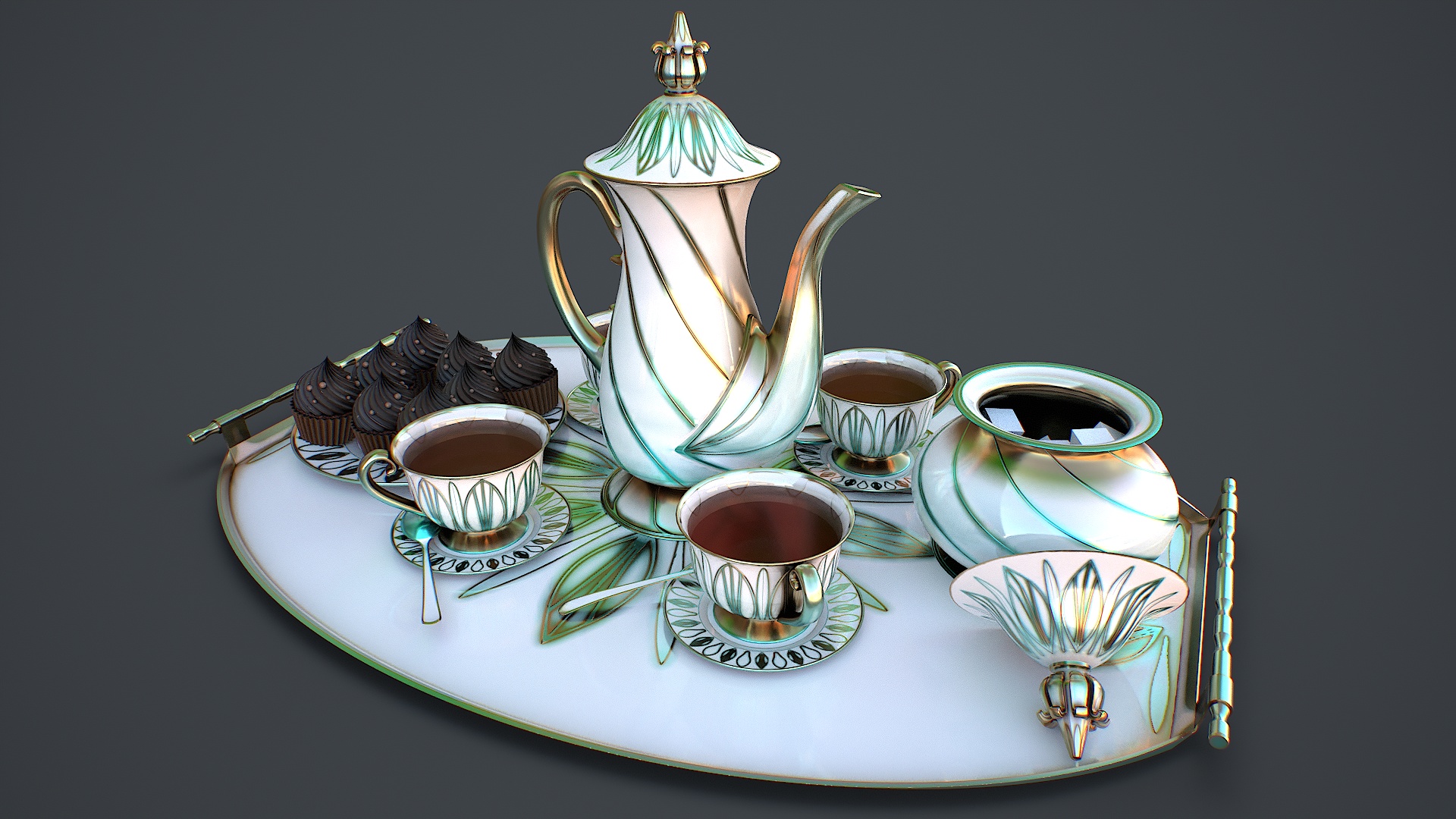 Hello. This is a high definition quality polygon of a Tea_set 1 3D Model with PBR textures. Extremely detailed and realistic. Suitable for movie prop, architectural visualizations, advertising renders, games, VR, AR and other. The archive includes Obj and FBX, Marmoset scene, textures for the Unity: Base color, Metallic, Mixed AO, Normal_OpenGL, Roughness. And also included in the archive textures for UE: BaseColor, Normal, OcclusionRoughnessMetallic. All textures are 4k resolution. The number of materials corresponds to the number of main objects in the scene. The model contains 83 objects: Tea_Set_1_tray, Tea_Set_1_teapot_lid_2th, Tea_Set_1_teapot, Tea_Set_1_tea_12th, Tea_Set_1_sugar_45th, Tea_Set_1_sugar_bowl, Tea_Set_1_spoon_4th, Tea_Set_1_plate_5th, Tea_Set_1_cake_8th, Tea_Set_1_mug_4th.
