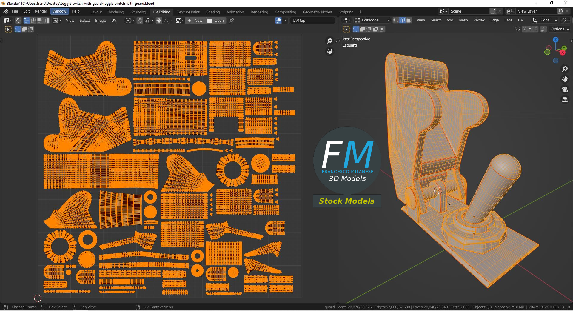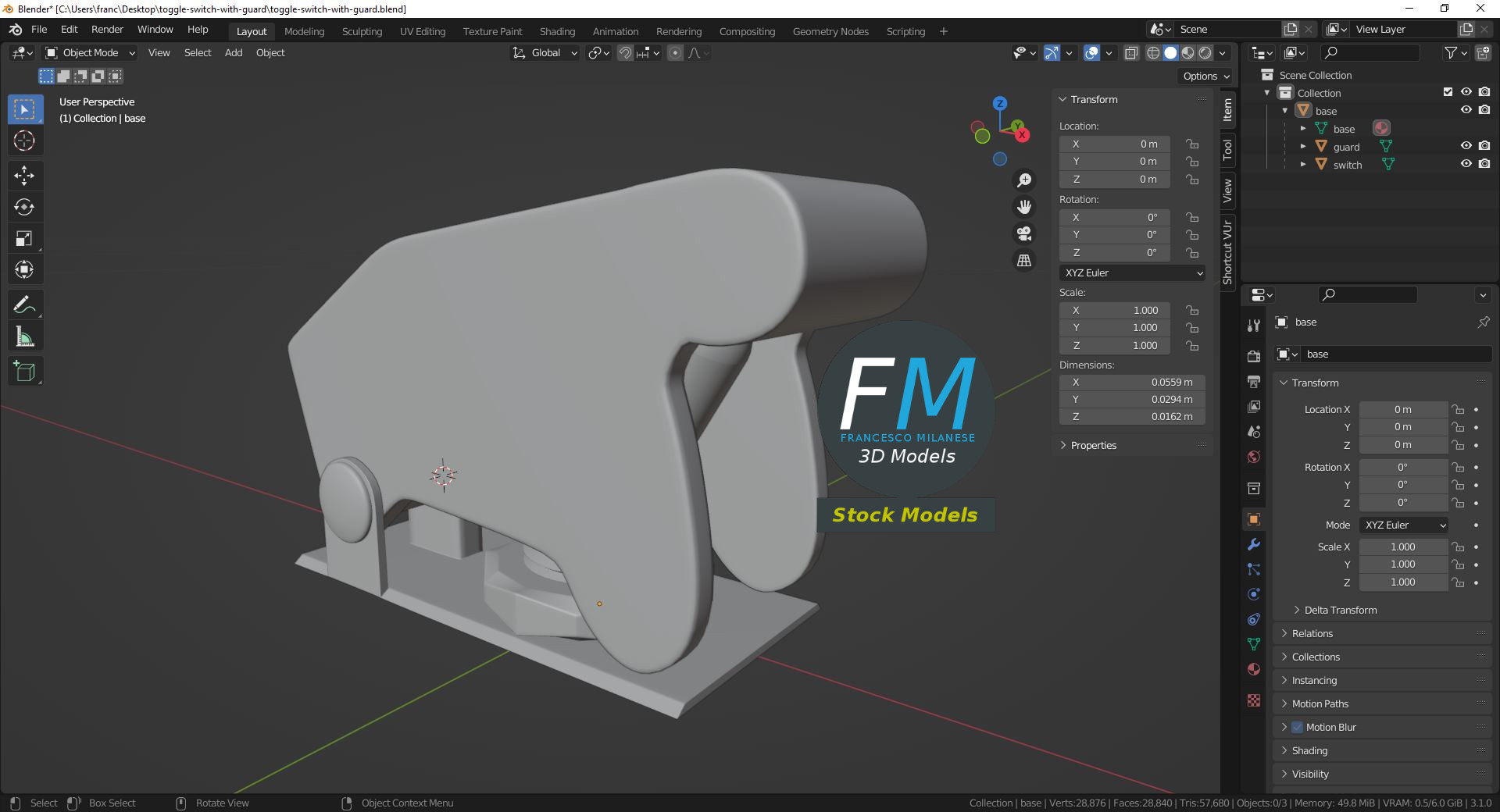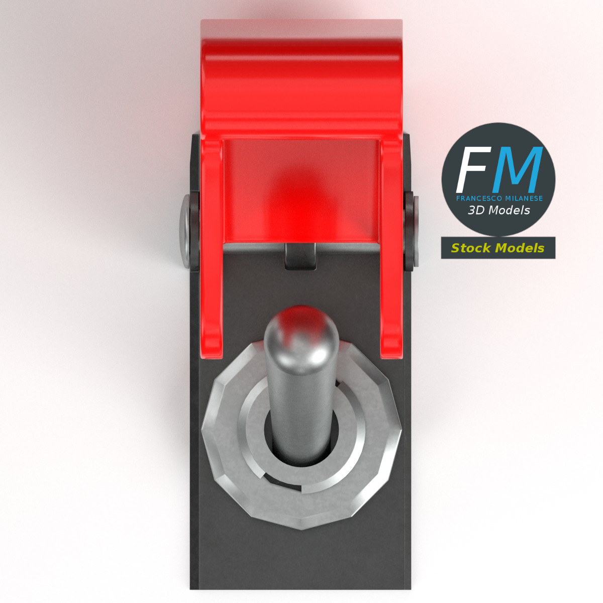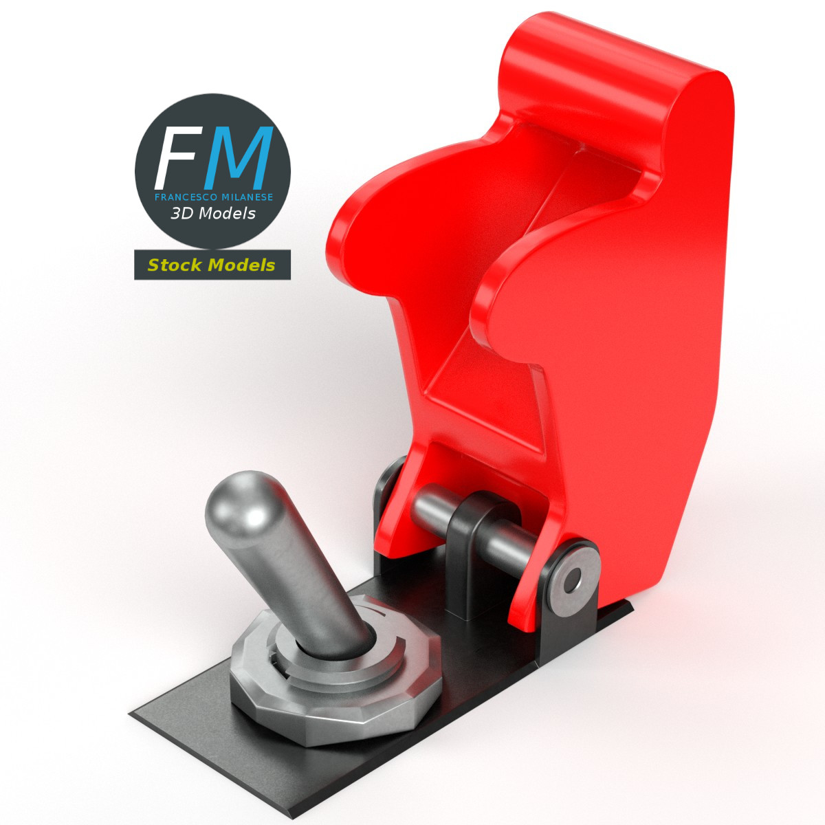 Toggle switch with guard cover 3D Model; just the upper part, to be used on panels: the bottom part and the spring are NOT modeled (take a look at the preview). 3 individual objects (cover, lever, base; so, you can easily rotate or even animate them), sharing the same non overlapping UV Layout map, Material and PBR Textures set. Production-ready 3D Model, with PBR materials, textures, non overlapping UV Layout map provided in the package.