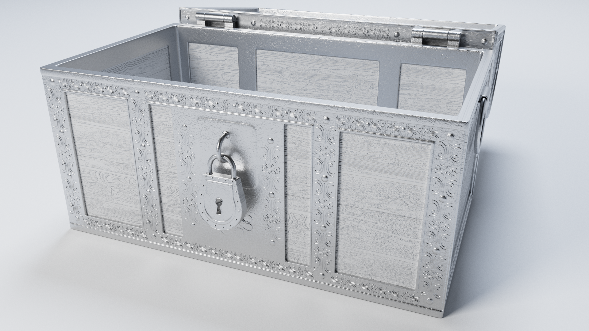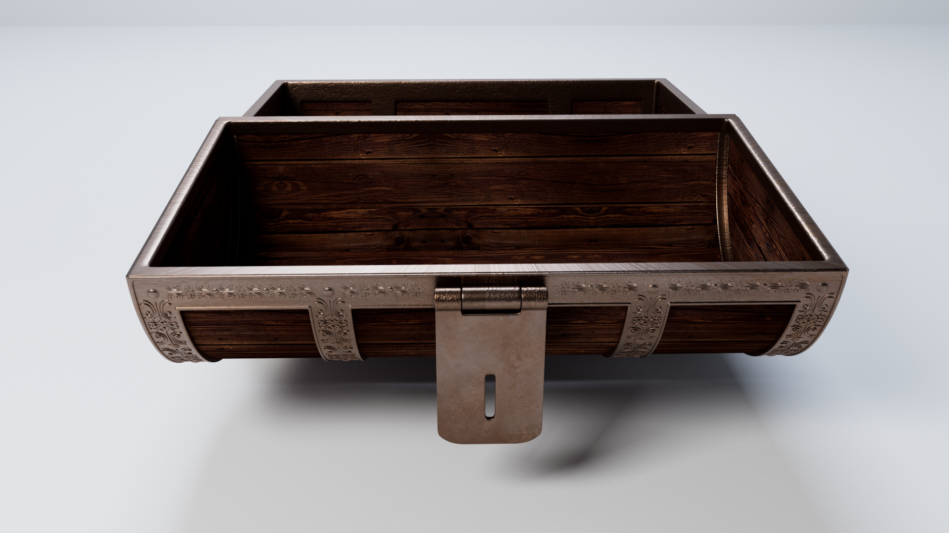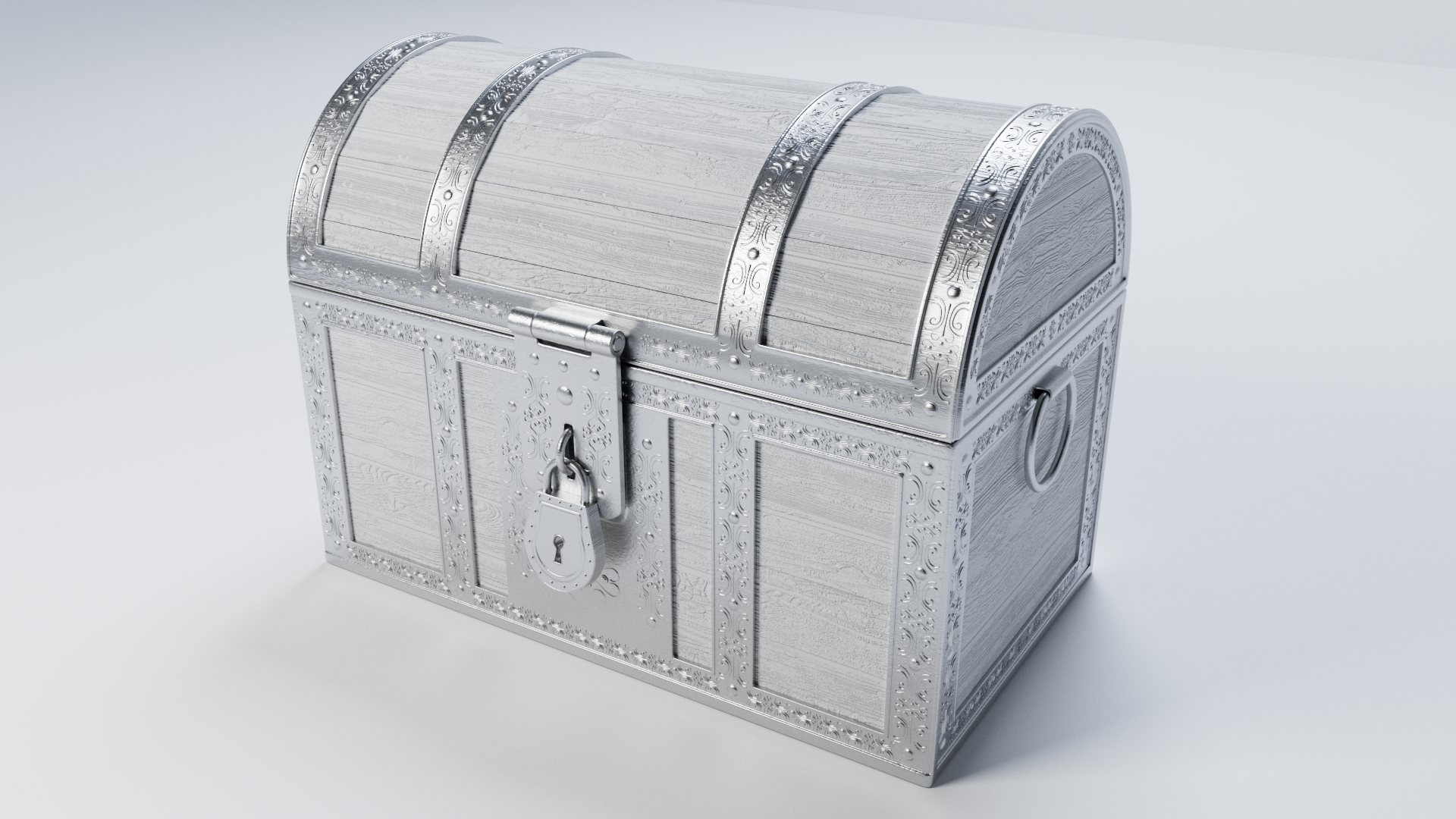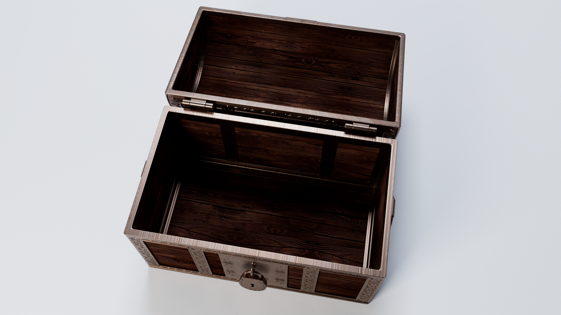 3d model of treasure chest. The file contains texture maps, color maps, bump maps, normal maps and meshes. Material are not included in the file. Cover images are rendered with vray materials and lights.