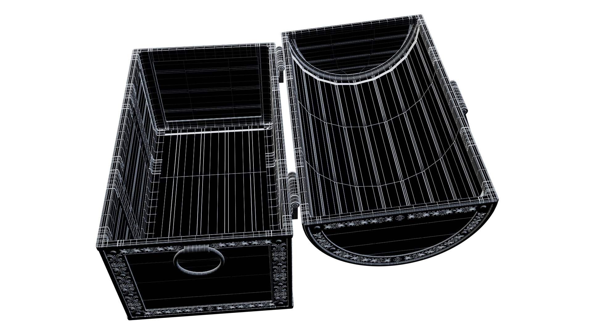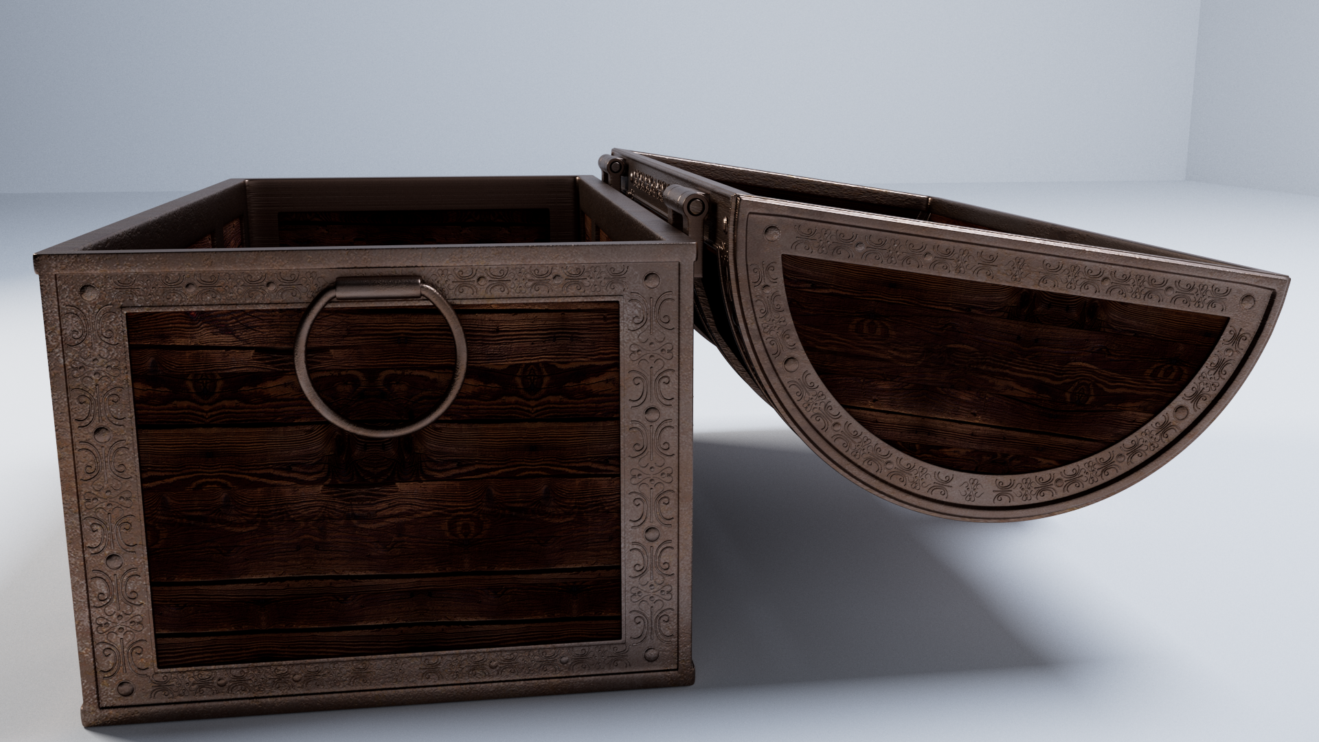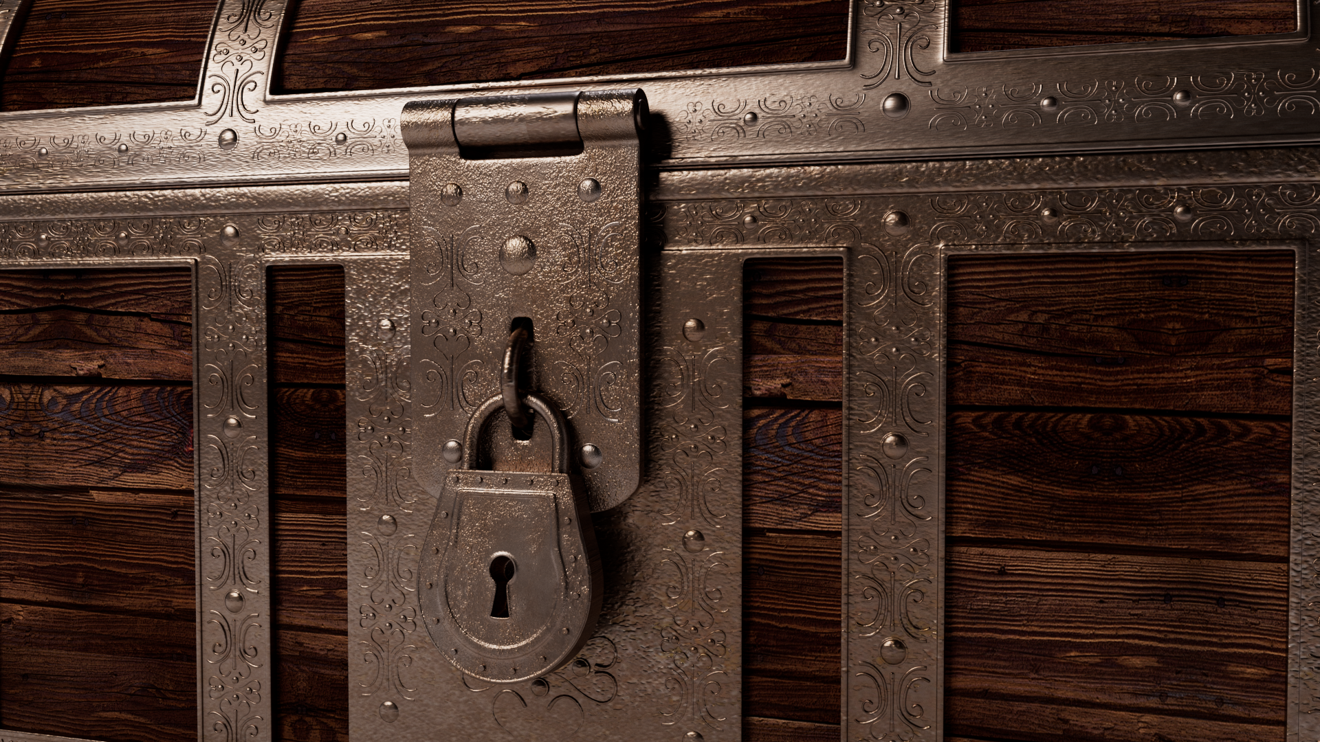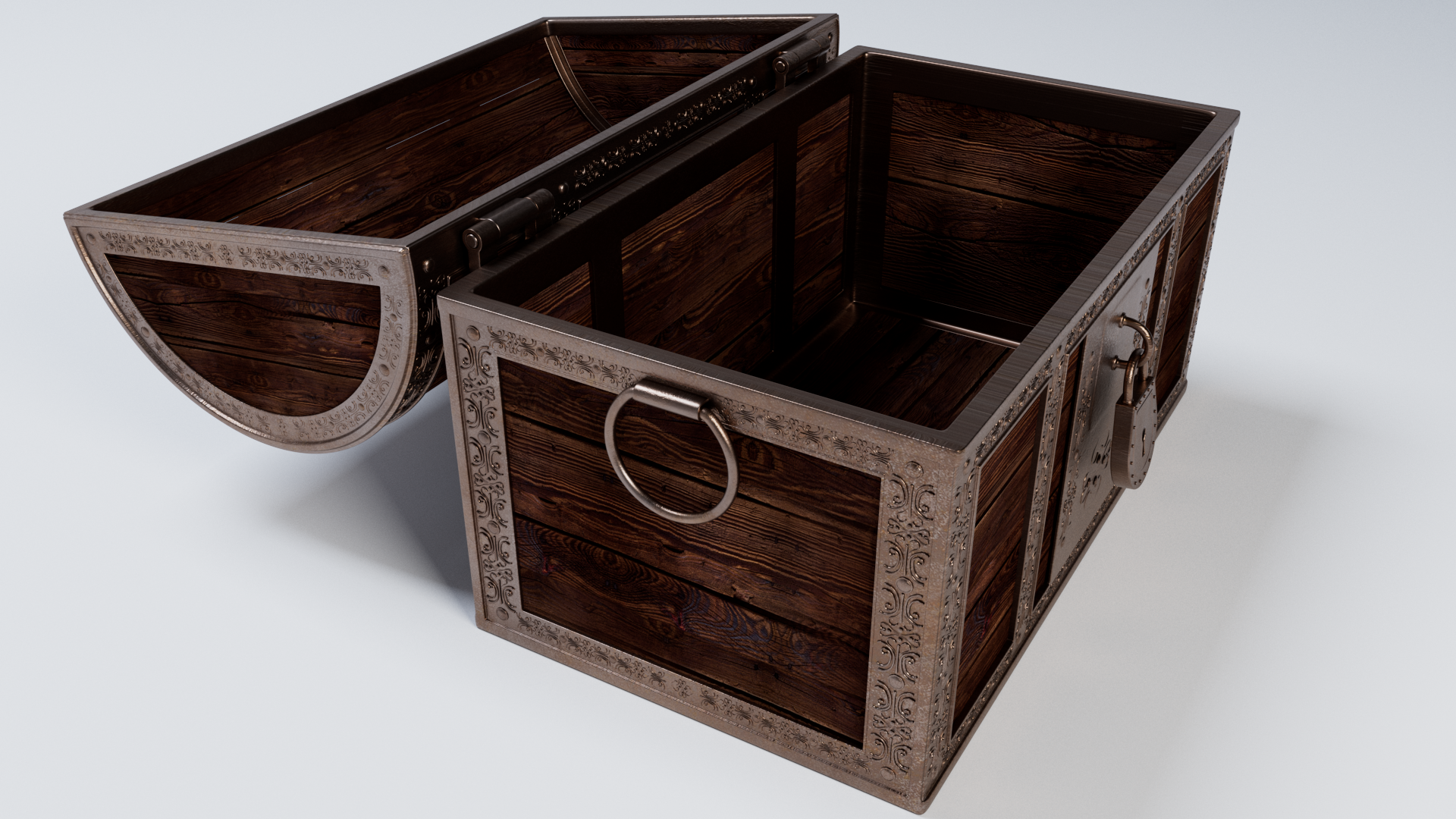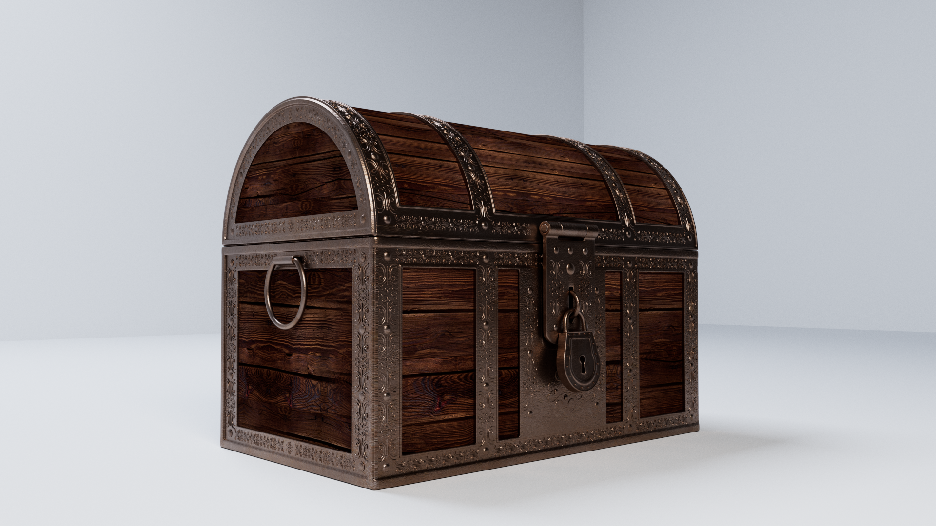 3d model of treasure chest. The file contains texture maps, color maps, bump maps, normal maps and meshes. Material are not included in the file. Cover images are rendered with vray materials and lights.