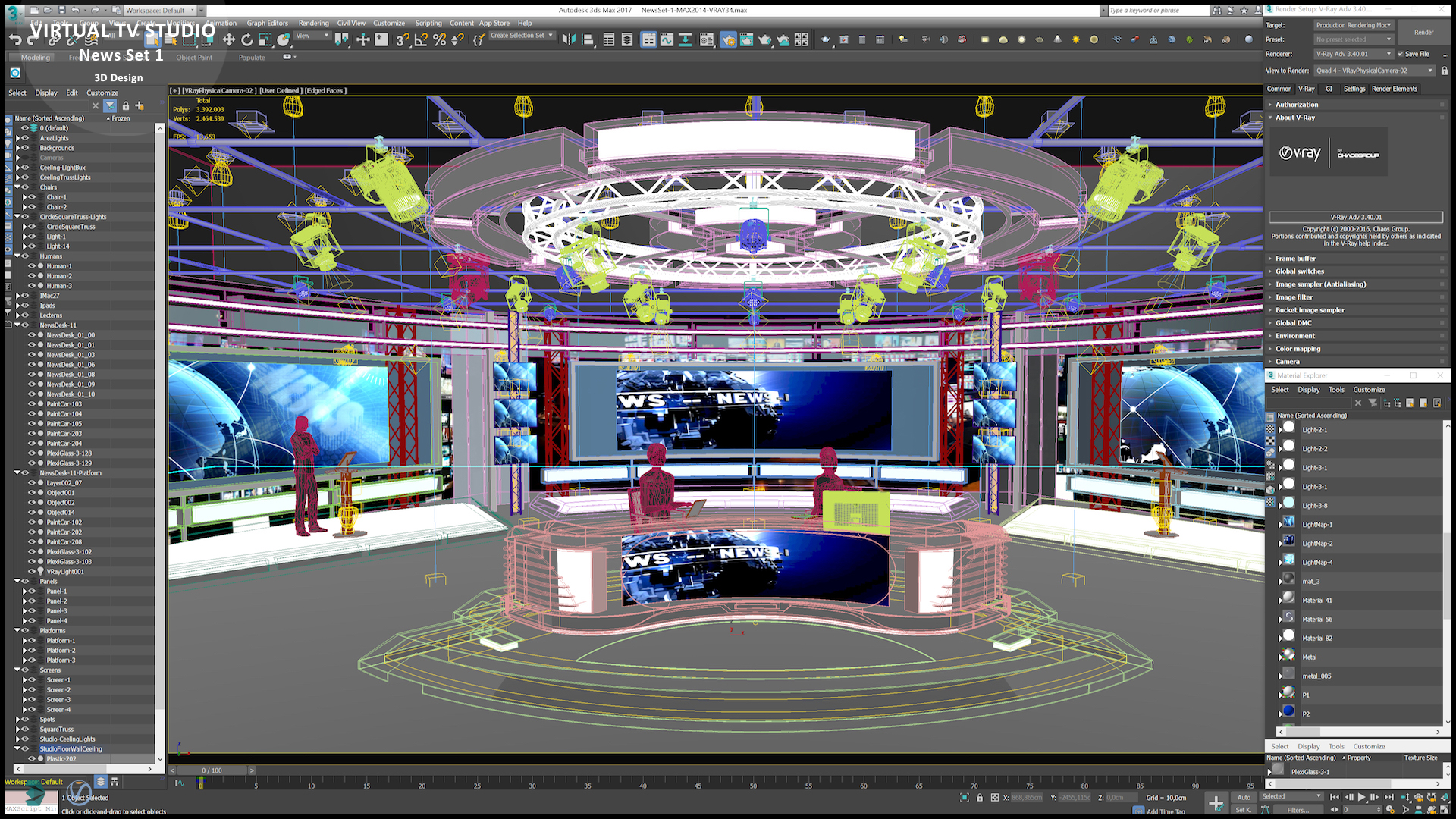 Product Info: - Is a high quality model to add more details and realism to the project. Suitable for 30×30ft (21×21m) physical studio. - Detailed drawings and plans Modeled in Real World Scale. - The models are made to real world scale using centimeters. - All objects are ready to use in your visualizations. The original software was created with 3DS Max 2014. - Scene is ready to render with professional shaders and lighting. - All objects, materials and textures of the project have been appropriately named. - For Physical Production, AutoCad format 2d plans are available. - Geometry: Polygonal. - Post production studios can use original formats to customize the studio to your own preferences. - Virtual set studio for color images. (8K-4K-UHD 3d Rendering at different camera angles) With a simple setup, you can turn a few square meters of space into a magnificent virtual set.
