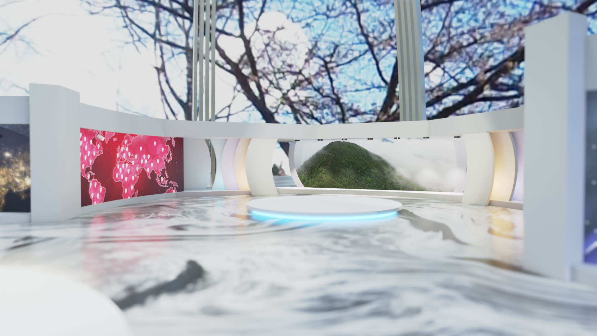 This is a high-quality 3D model of a modern virtual studio featuring 5 large LED screens, ideal for creating immersive virtual environments or broadcast setups. The open-roof design allows for versatile camera angles and lighting setups. The package includes a .blend file with pre-configured lighting and render settings optimized for Eevee, ensuring fast and efficient rendering. Perfect for TV, online streaming, and visual presentations. Ready to use and easy to customize!