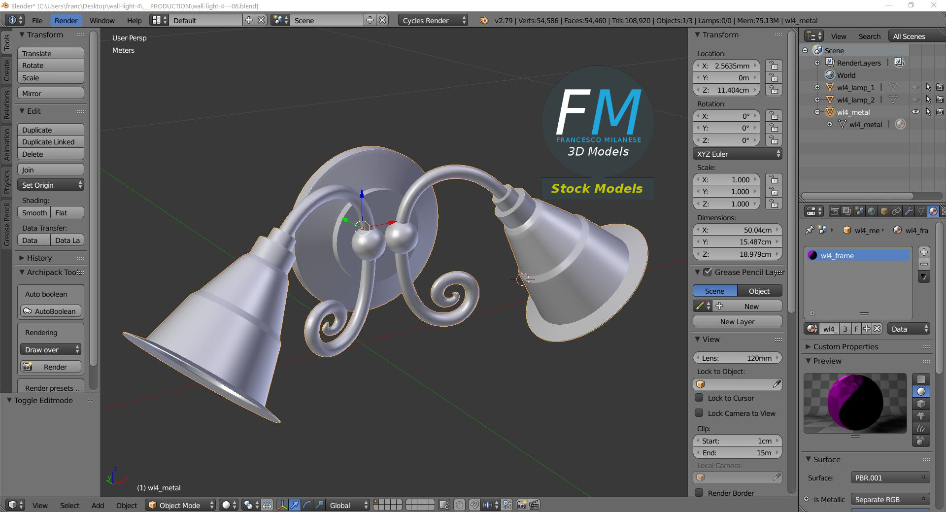 Wall light 3D Model, nr. 4 in my collection. 3 individual objects (frame, lamp 1, lamp 2), sharing 2 non overlapping UV Layout maps, Materials (frame, glass) and PBR Textures sets. Production-ready 3D Model, with PBR materials, textures, non overlapping UV Layout map provided in the package.