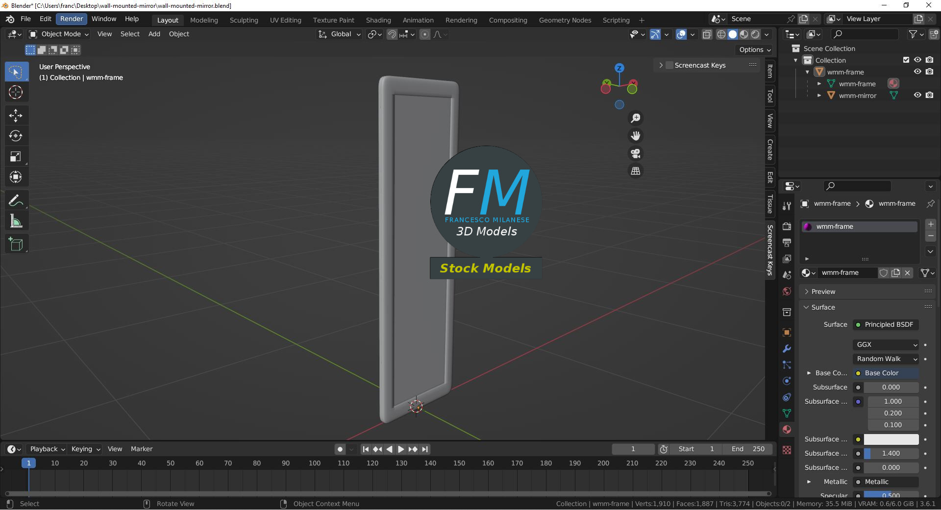 Sketchfab 3D preview: https://sketchfab.com/3d-models/wall-mounted-mirror-5436b0afee294ea7857fb71387f6c9b6